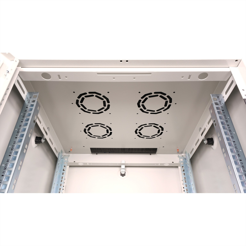 The network cabinets in the ROLINE Basic series were developed to enable simple and particularly cost-efficient network expansion. Strategically placed cable inlets ensure effortless installation depending on the application. The cable inlet is located in the base chassis, protected by a screwed cover plate and positioned in the rear centre area. For enclosures from 800 mm width, additional cable inlets with plastic covers are added on the left and right. These are also integrated in the roof (once for 600 mm enclosure width, three times for 800 mm enclosure width). The roof chassis also has a punched-out area for the installation of a fan module. Two pairs of galvanised 19" profile rails are installed inside, which can be read in both directions and can be adjusted in depth. They are also connected to additional depth struts in the enclosure. Each cabinet consists of a robust steel construction with a material thickness of up to 1.5 mm sheet steel.