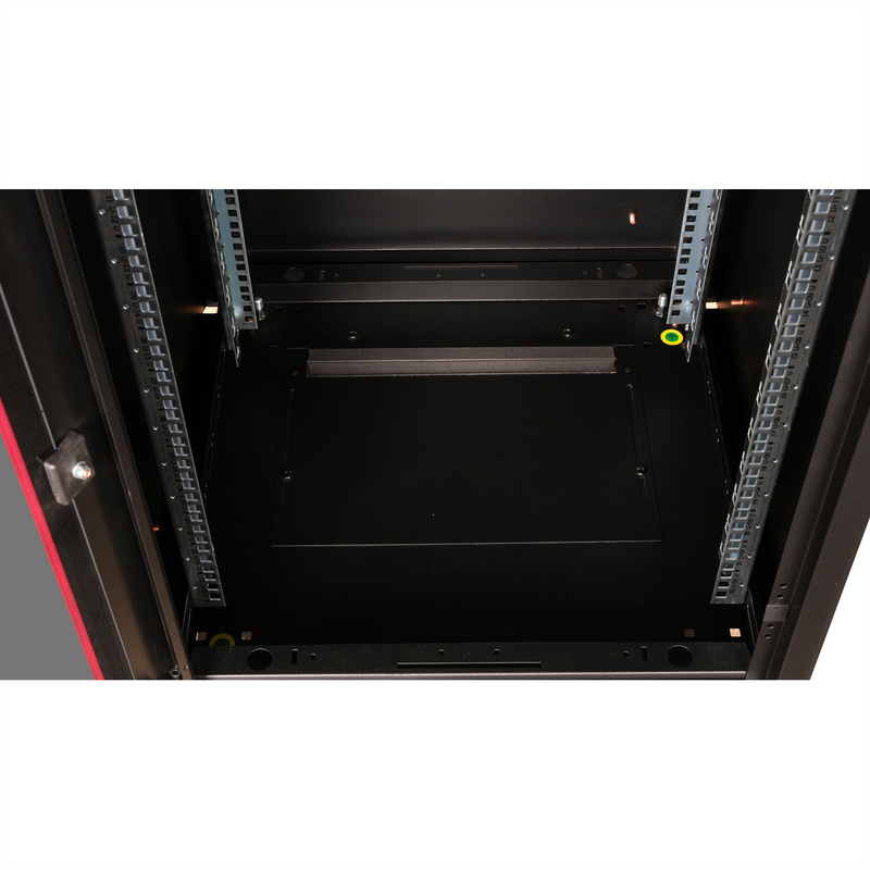 The network cabinets in the ROLINE Pro series have been developed to enable particularly convenient and flexible network cabling. With brush inlets in the roof and base area (from 26U and 800 mm cabinet width), a slide-on inlet in the base chassis with foam rubber seal and brush strips above and below the rear door (from 26U), they offer a wide range of possible uses for various application scenarios. Vertical cable ducts with cover, installed next to the profile rails (from 800 mm enclosure width), complete the design. A stepped, removable cover with ventilation slots improves air circulation and allows easy installation of a fan module. Two pairs of galvanised 19" profile rails are installed inside, which can be read in both directions and are adjustable in depth. They are also connected to additional depth struts in the enclosure. Each cabinet consists of a robust steel construction with a material thickness of up to 1.5 mm sheet steel.