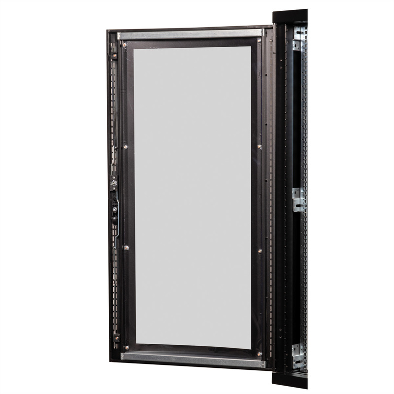 Two pairs of galvanised 19" profile rails are mounted inside the cabinet, which are equipped with height units that can be read in both directions and are adjustable in depth. They are also connected with depth braces. Each cabinet consists of a robust steel construction with a material thickness of up to 2.0 mm. The cabinets are electrostatically powder-coated and available in the standard colours grey (RAL 7035) and black (RAL 9005). Modular lockable and removable side panels (horizontally divided from 42U) and doors improve accessibility. The door hinges can also be changed. The entire construction can be dismantled, meaning that the cabinets can be completely removed if required.
