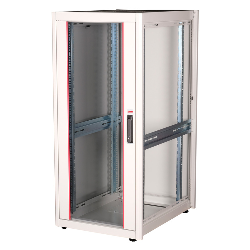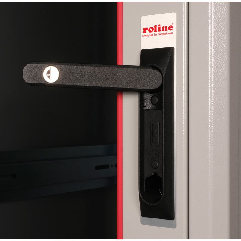 The network cabinets in the ROLINE Basic series were developed to enable simple and particularly cost-efficient network expansion. Strategically placed cable inlets ensure effortless installation depending on the application. The cable inlet is located in the base chassis, protected by a screwed cover plate and positioned in the rear centre area. For enclosures from 800 mm width, additional cable inlets with plastic covers are added on the left and right. These are also integrated in the roof (once for 600 mm enclosure width, three times for 800 mm enclosure width). The roof chassis also has a punched-out area for the installation of a fan module. Two pairs of galvanised 19" profile rails are installed inside, which can be read in both directions and can be adjusted in depth. They are also connected to additional depth struts in the enclosure. Each cabinet consists of a robust steel construction with a material thickness of up to 1.5 mm sheet steel.