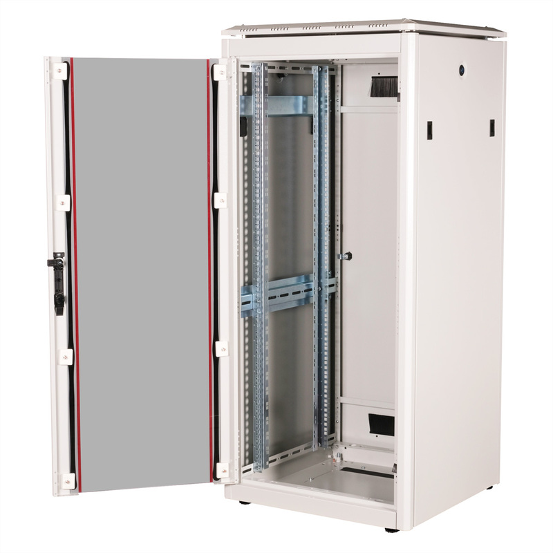 The network cabinets in the ROLINE Pro series have been developed to enable particularly convenient and flexible network cabling. With brush inlets in the roof and base area (from 26U and 800 mm cabinet width), a slide-on inlet in the base chassis with foam rubber seal and brush strips above and below the rear door (from 26U), they offer a wide range of possible uses for various application scenarios. Vertical cable ducts with cover, installed next to the profile rails (from 800 mm enclosure width), complete the design. A stepped, removable cover with ventilation slots improves air circulation and allows easy installation of a fan module. Two pairs of galvanised 19" profile rails are installed inside, which can be read in both directions and are adjustable in depth. They are also connected to additional depth struts in the enclosure. Each cabinet consists of a robust steel construction with a material thickness of up to 1.5 mm sheet steel.