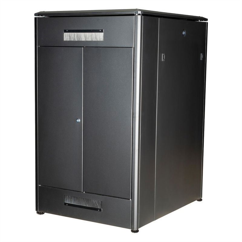 The network cabinets in the ROLINE Pro series have been developed to enable particularly convenient and flexible network cabling. With brush inlets in the roof and base area (from 26U and 800 mm cabinet width), a slide-on inlet in the base chassis with foam rubber seal and brush strips above and below the rear door (from 26U), they offer a wide range of possible uses for various application scenarios. Vertical cable ducts with cover, installed next to the profile rails (from 800 mm enclosure width), complete the design. A stepped, removable cover with ventilation slots improves air circulation and allows easy installation of a fan module. Two pairs of galvanised 19" profile rails are installed inside, which can be read in both directions and are adjustable in depth. They are also connected to additional depth struts in the enclosure. Each cabinet consists of a robust steel construction with a material thickness of up to 1.5 mm sheet steel.