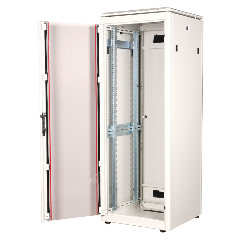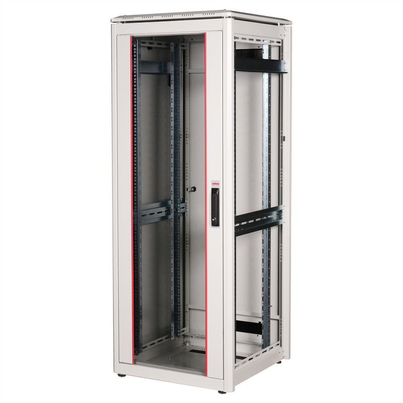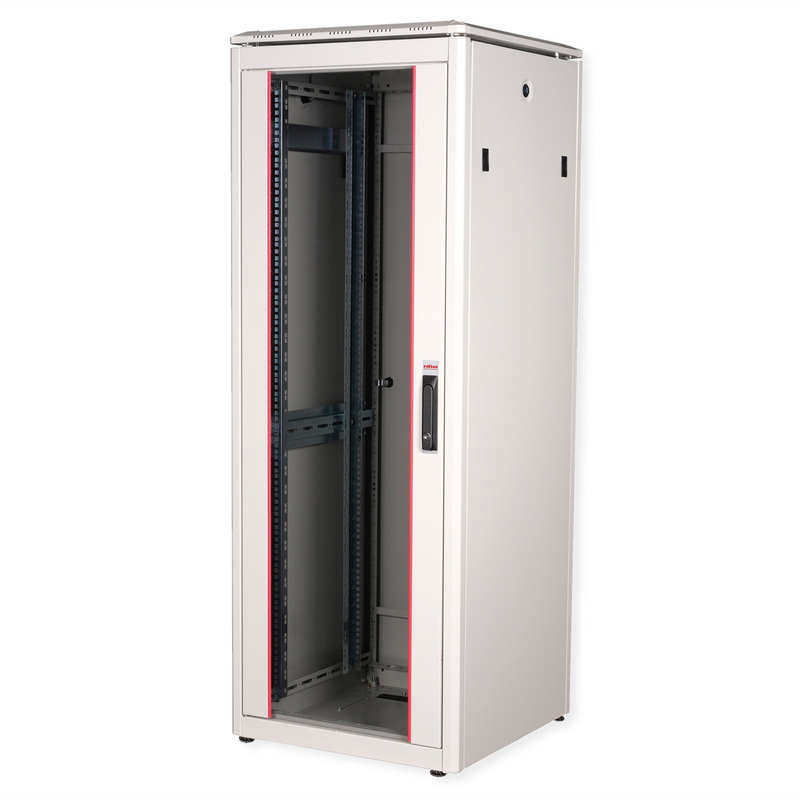 The network cabinets in the ROLINE Pro series have been developed to enable particularly convenient and flexible network cabling. With brush inlets in the roof and base area (from 26U and 800 mm cabinet width), a slide-on inlet in the base chassis with foam rubber seal and brush strips above and below the rear door (from 26U), they offer a wide range of possible uses for various application scenarios. Vertical cable ducts with cover, installed next to the profile rails (from 800 mm enclosure width), complete the design. A stepped, removable cover with ventilation slots improves air circulation and allows easy installation of a fan module. Two pairs of galvanised 19" profile rails are installed inside, which can be read in both directions and are adjustable in depth. They are also connected to additional depth struts in the enclosure. Each cabinet consists of a robust steel construction with a material thickness of up to 1.5 mm sheet steel.