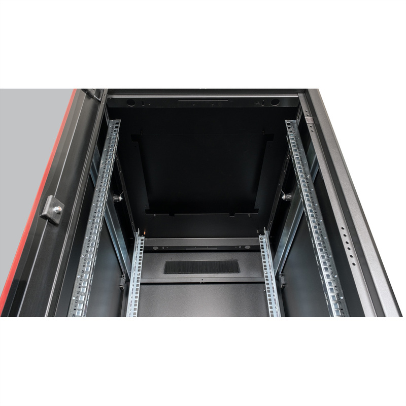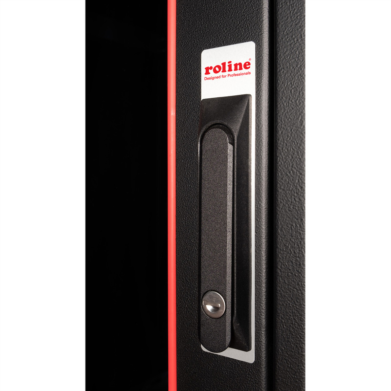 The network cabinets in the ROLINE Pro series have been developed to enable particularly convenient and flexible network cabling. With brush inlets in the roof and base area (from 26U and 800 mm cabinet width), a slide-on inlet in the base chassis with foam rubber seal and brush strips above and below the rear door (from 26U), they offer a wide range of possible uses for various application scenarios. Vertical cable ducts with cover, installed next to the profile rails (from 800 mm enclosure width), complete the design. A stepped, removable cover with ventilation slots improves air circulation and allows easy installation of a fan module. Two pairs of galvanised 19" profile rails are installed inside, which can be read in both directions and are adjustable in depth. They are also connected to additional depth struts in the enclosure. Each cabinet consists of a robust steel construction with a material thickness of up to 1.5 mm sheet steel.