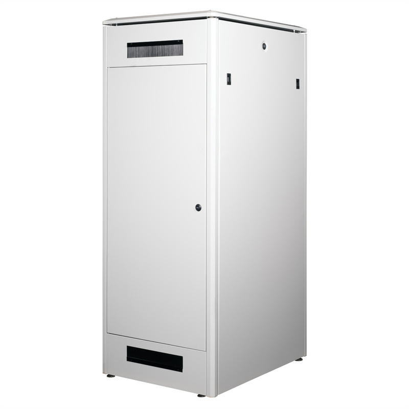 The network cabinets in the ROLINE Pro series have been developed to enable particularly convenient and flexible network cabling. With brush inlets in the roof and base area (from 26U and 800 mm cabinet width), a slide-on inlet in the base chassis with foam rubber seal and brush strips above and below the rear door (from 26U), they offer a wide range of possible uses for various application scenarios. Vertical cable ducts with cover, installed next to the profile rails (from 800 mm enclosure width), complete the design. A stepped, removable cover with ventilation slots improves air circulation and allows easy installation of a fan module. Two pairs of galvanised 19" profile rails are installed inside, which can be read in both directions and are adjustable in depth. They are also connected to additional depth struts in the enclosure. Each cabinet consists of a robust steel construction with a material thickness of up to 1.5 mm sheet steel.