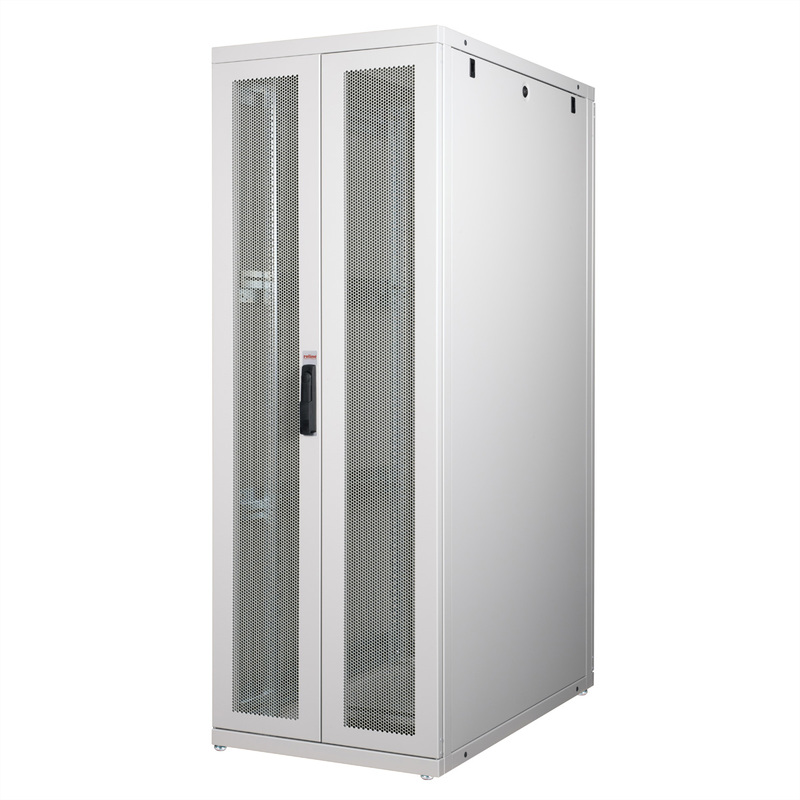 Two pairs of galvanised 19" profile rails are mounted inside the cabinet, which are equipped with height units that can be read in both directions and are adjustable in depth. They are also connected with depth braces. Each cabinet consists of a robust steel construction with a material thickness of up to 2.0 mm. The cabinets are electrostatically powder-coated and available in the standard colours grey (RAL 7035) and black (RAL 9005). Modular lockable and removable side panels (horizontally divided from 42U) and doors improve accessibility. The door hinges can also be changed. The entire construction can be dismantled, meaning that the cabinets can be completely removed if required.