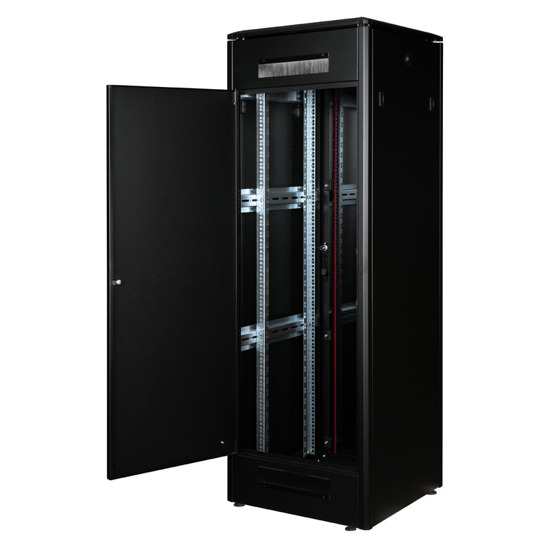 The network cabinets in the ROLINE Pro series have been developed to enable particularly convenient and flexible network cabling. With brush inlets in the roof and base area (from 26U and 800 mm cabinet width), a slide-on inlet in the base chassis with foam rubber seal and brush strips above and below the rear door (from 26U), they offer a wide range of possible uses for various application scenarios. Vertical cable ducts with cover, installed next to the profile rails (from 800 mm enclosure width), complete the design. A stepped, removable cover with ventilation slots improves air circulation and allows easy installation of a fan module. Two pairs of galvanised 19" profile rails are installed inside, which can be read in both directions and are adjustable in depth. They are also connected to additional depth struts in the enclosure. Each cabinet consists of a robust steel construction with a material thickness of up to 1.5 mm sheet steel.