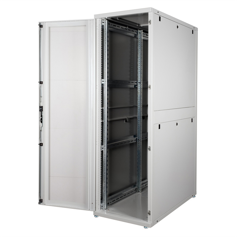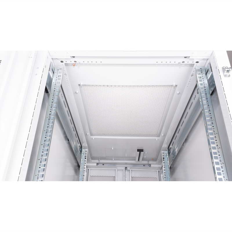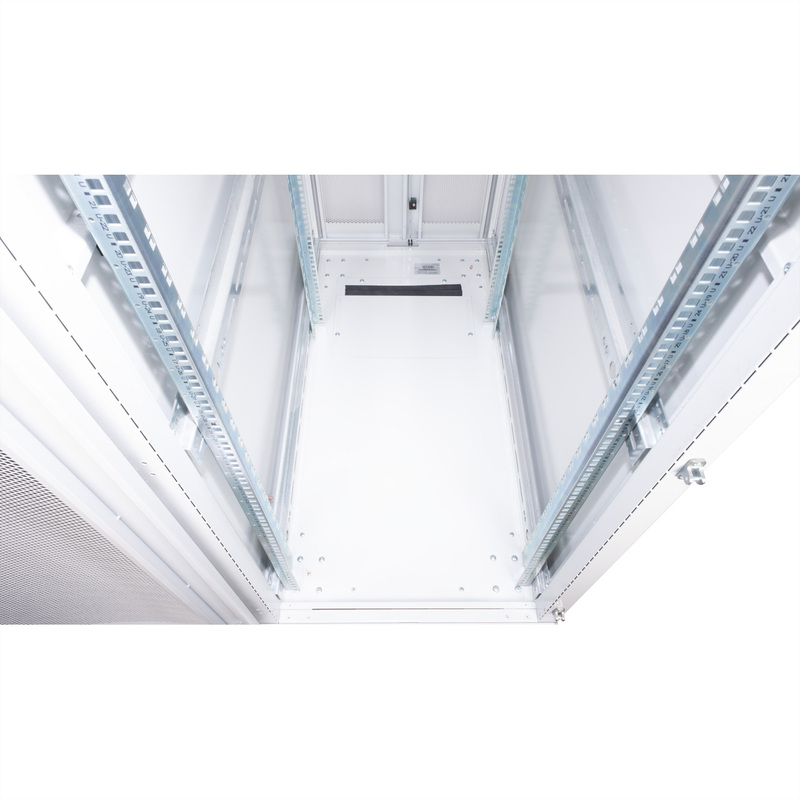 Two pairs of galvanised 19" profile rails are mounted inside the cabinet, which are equipped with height units that can be read in both directions and are adjustable in depth. They are also connected with depth braces. Each cabinet consists of a robust steel construction with a material thickness of up to 2.0 mm. The cabinets are electrostatically powder-coated and available in the standard colours grey (RAL 7035) and black (RAL 9005). Modular lockable and removable side panels (horizontally divided from 42U) and doors improve accessibility. The door hinges can also be changed. The entire construction can be dismantled, meaning that the cabinets can be completely removed if required.