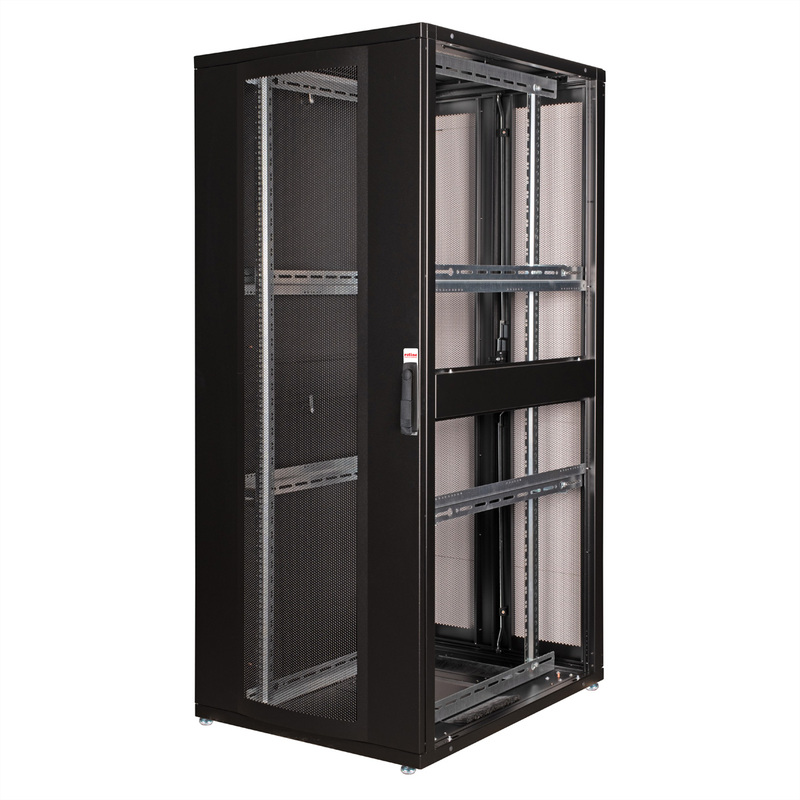 Two pairs of galvanised 19" profile rails are mounted inside the cabinet, which are equipped with height units that can be read in both directions and are adjustable in depth. They are also connected with depth braces. Each cabinet consists of a robust steel construction with a material thickness of up to 2.0 mm. The cabinets are electrostatically powder-coated and available in the standard colours grey (RAL 7035) and black (RAL 9005). Modular lockable and removable side panels (horizontally divided from 42U) and doors improve accessibility. The door hinges can also be changed. The entire construction can be dismantled, meaning that the cabinets can be completely removed if required.