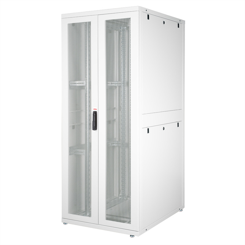 Two pairs of galvanised 19" profile rails are mounted inside the cabinet, which are equipped with height units that can be read in both directions and are adjustable in depth. They are also connected with depth braces. Each cabinet consists of a robust steel construction with a material thickness of up to 2.0 mm. The cabinets are electrostatically powder-coated and available in the standard colours grey (RAL 7035) and black (RAL 9005). Modular lockable and removable side panels (horizontally divided from 42U) and doors improve accessibility. The door hinges can also be changed. The entire construction can be dismantled, meaning that the cabinets can be completely removed if required.