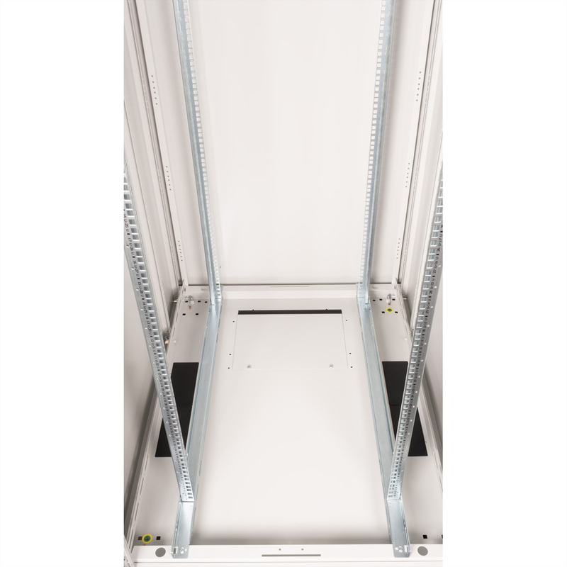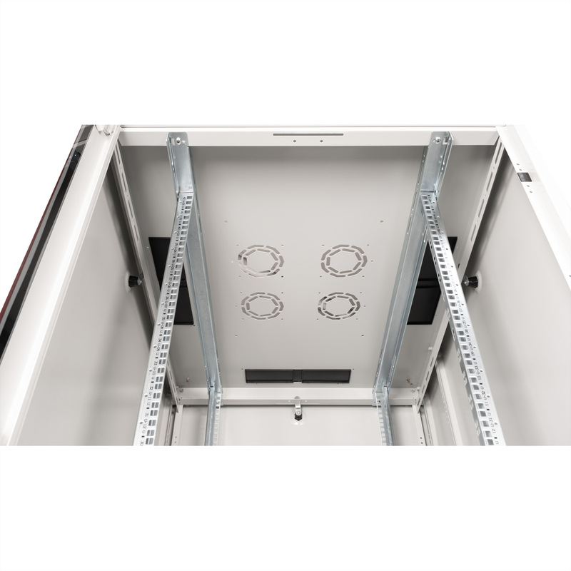 The network cabinets in the ROLINE Basic series were developed to enable simple and particularly cost-efficient network expansion. Strategically placed cable inlets ensure effortless installation depending on the application. The cable inlet is located in the base chassis, protected by a screwed cover plate and positioned in the rear centre area. For enclosures from 800 mm width, additional cable inlets with plastic covers are added on the left and right. These are also integrated in the roof (once for 600 mm enclosure width, three times for 800 mm enclosure width). The roof chassis also has a punched-out area for the installation of a fan module. Two pairs of galvanised 19" profile rails are installed inside, which can be read in both directions and can be adjusted in depth. They are also connected to additional depth struts in the enclosure. Each cabinet consists of a robust steel construction with a material thickness of up to 1.5 mm sheet steel.