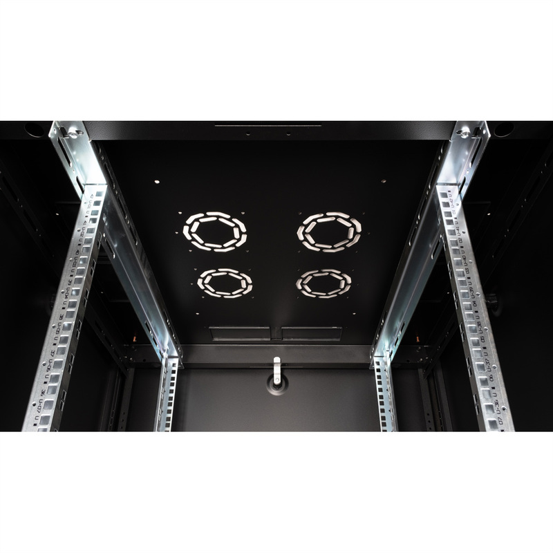 The network cabinets in the ROLINE Basic series were developed to enable simple and particularly cost-efficient network expansion. Strategically placed cable inlets ensure effortless installation depending on the application. The cable inlet is located in the base chassis, protected by a screwed cover plate and positioned in the rear centre area. For enclosures from 800 mm width, additional cable inlets with plastic covers are added on the left and right. These are also integrated in the roof (once for 600 mm enclosure width, three times for 800 mm enclosure width). The roof chassis also has a punched-out area for the installation of a fan module. Two pairs of galvanised 19" profile rails are installed inside, which can be read in both directions and can be adjusted in depth. They are also connected to additional depth struts in the enclosure. Each cabinet consists of a robust steel construction with a material thickness of up to 1.5 mm sheet steel.