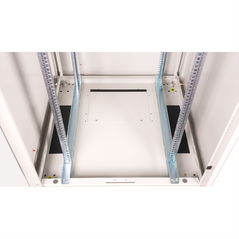 The network cabinets in the ROLINE Basic series were developed to enable simple and particularly cost-efficient network expansion. Strategically placed cable inlets ensure effortless installation depending on the application. The cable inlet is located in the base chassis, protected by a screwed cover plate and positioned in the rear centre area. For enclosures from 800 mm width, additional cable inlets with plastic covers are added on the left and right. These are also integrated in the roof (once for 600 mm enclosure width, three times for 800 mm enclosure width). The roof chassis also has a punched-out area for the installation of a fan module. Two pairs of galvanised 19" profile rails are installed inside, which can be read in both directions and can be adjusted in depth. They are also connected to additional depth struts in the enclosure. Each cabinet consists of a robust steel construction with a material thickness of up to 1.5 mm sheet steel.
