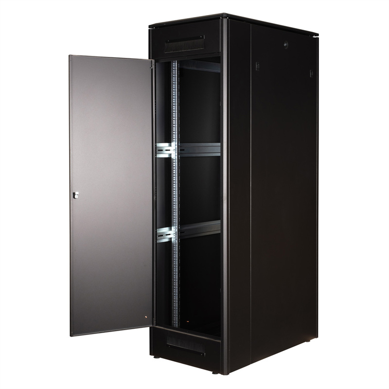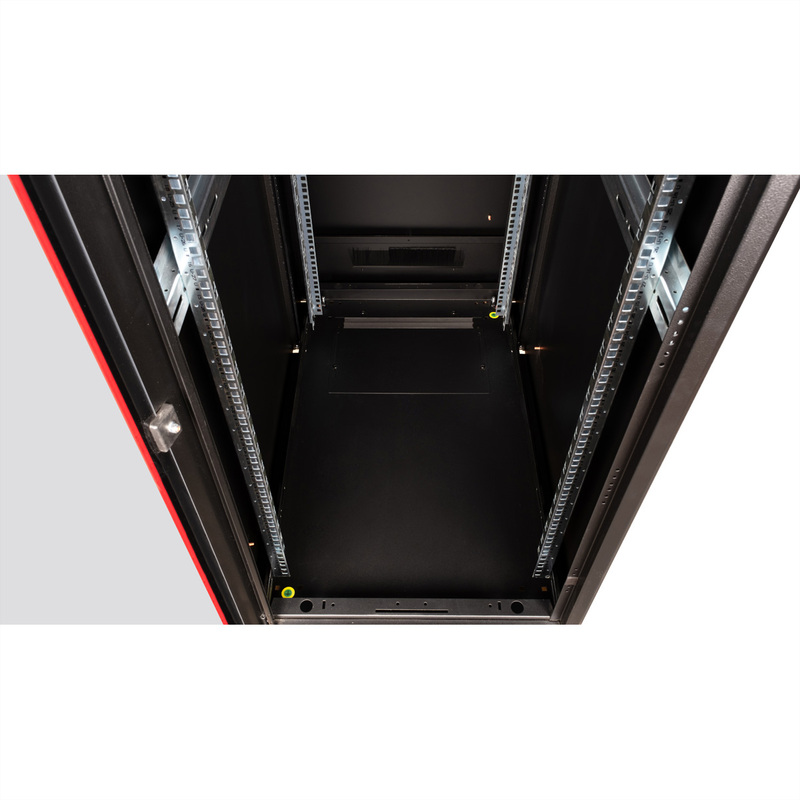 The network cabinets in the ROLINE Pro series have been developed to enable particularly convenient and flexible network cabling. With brush inlets in the roof and base area (from 26U and 800 mm cabinet width), a slide-on inlet in the base chassis with foam rubber seal and brush strips above and below the rear door (from 26U), they offer a wide range of possible uses for various application scenarios. Vertical cable ducts with cover, installed next to the profile rails (from 800 mm enclosure width), complete the design. A stepped, removable cover with ventilation slots improves air circulation and allows easy installation of a fan module. Two pairs of galvanised 19" profile rails are installed inside, which can be read in both directions and are adjustable in depth. They are also connected to additional depth struts in the enclosure. Each cabinet consists of a robust steel construction with a material thickness of up to 1.5 mm sheet steel.