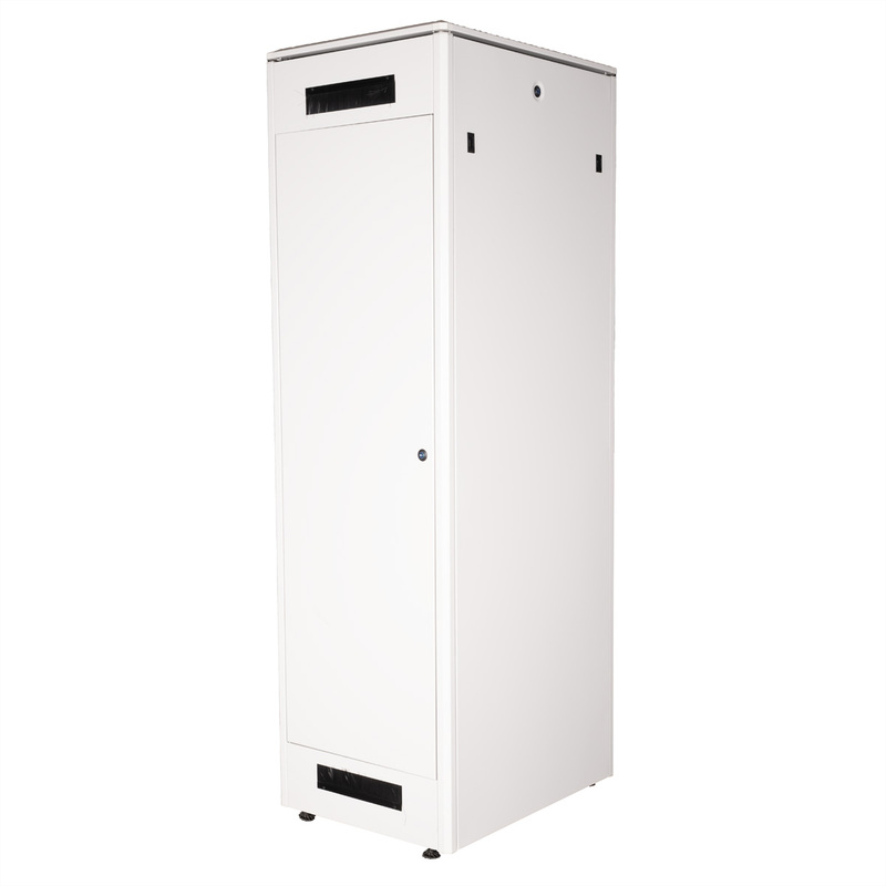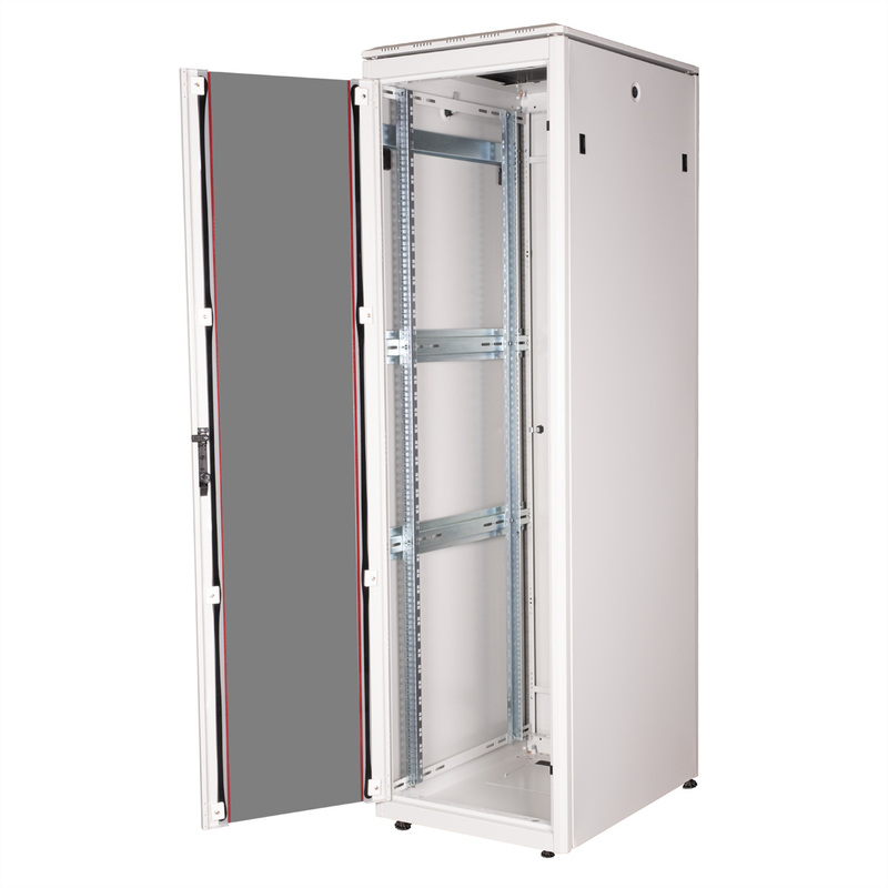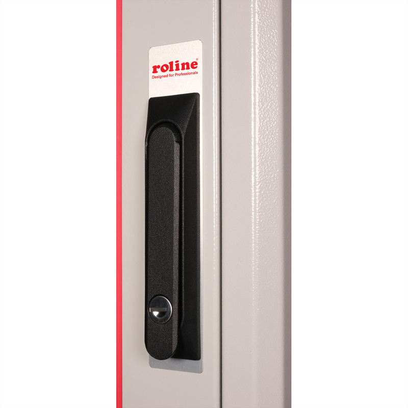 The network cabinets in the ROLINE Pro series have been developed to enable particularly convenient and flexible network cabling. With brush inlets in the roof and base area (from 26U and 800 mm cabinet width), a slide-on inlet in the base chassis with foam rubber seal and brush strips above and below the rear door (from 26U), they offer a wide range of possible uses for various application scenarios. Vertical cable ducts with cover, installed next to the profile rails (from 800 mm enclosure width), complete the design. A stepped, removable cover with ventilation slots improves air circulation and allows easy installation of a fan module. Two pairs of galvanised 19" profile rails are installed inside, which can be read in both directions and are adjustable in depth. They are also connected to additional depth struts in the enclosure. Each cabinet consists of a robust steel construction with a material thickness of up to 1.5 mm sheet steel.