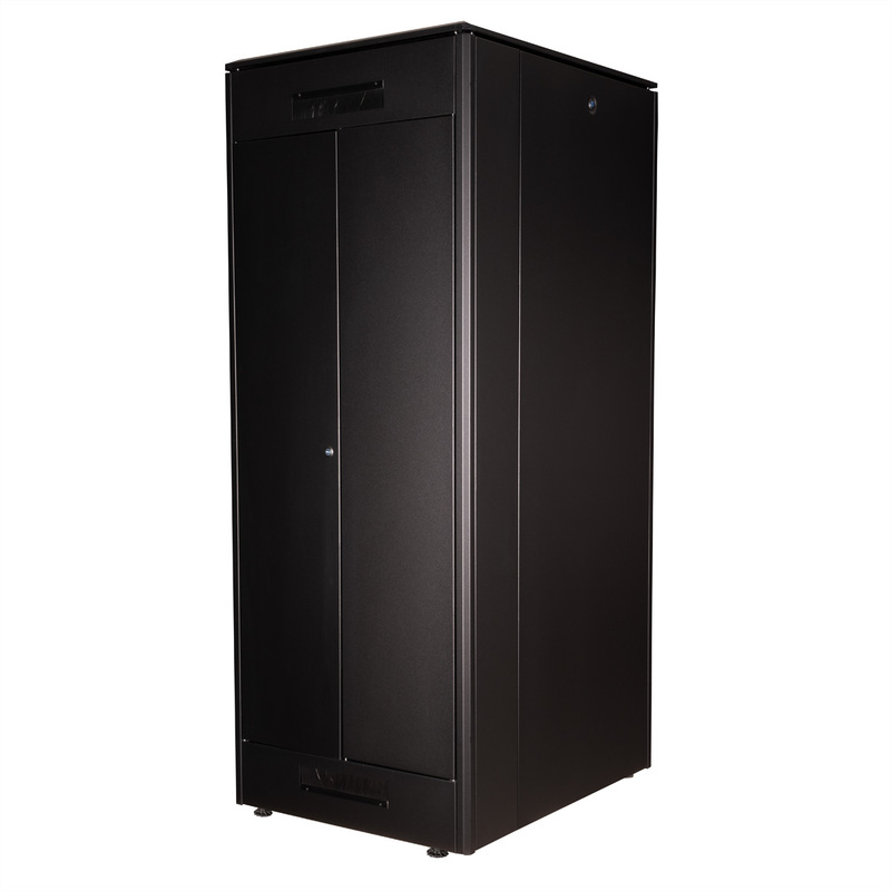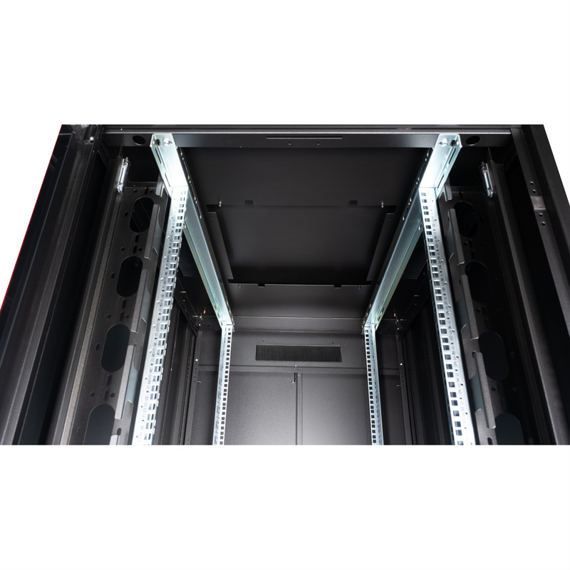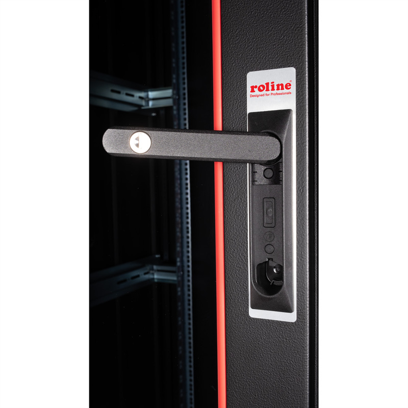 The network cabinets in the ROLINE Pro series have been developed to enable particularly convenient and flexible network cabling. With brush inlets in the roof and base area (from 26U and 800 mm cabinet width), a slide-on inlet in the base chassis with foam rubber seal and brush strips above and below the rear door (from 26U), they offer a wide range of possible uses for various application scenarios. Vertical cable ducts with cover, installed next to the profile rails (from 800 mm enclosure width), complete the design. A stepped, removable cover with ventilation slots improves air circulation and allows easy installation of a fan module. Two pairs of galvanised 19" profile rails are installed inside, which can be read in both directions and are adjustable in depth. They are also connected to additional depth struts in the enclosure. Each cabinet consists of a robust steel construction with a material thickness of up to 1.5 mm sheet steel.