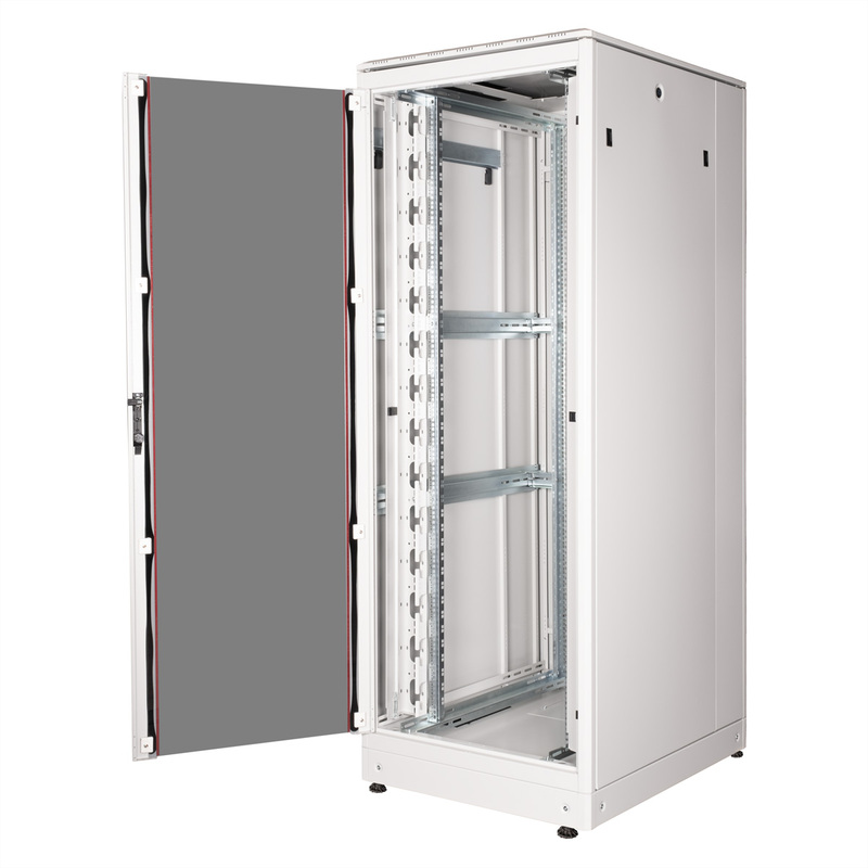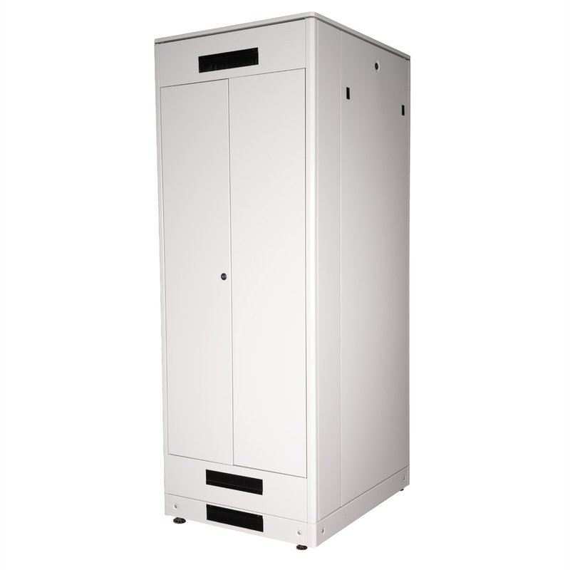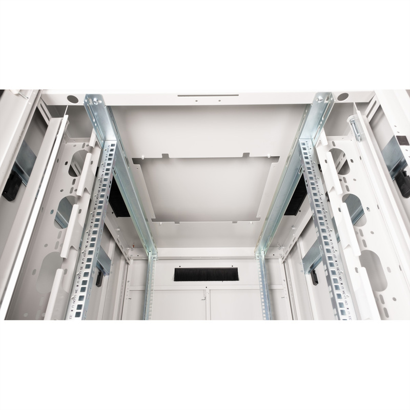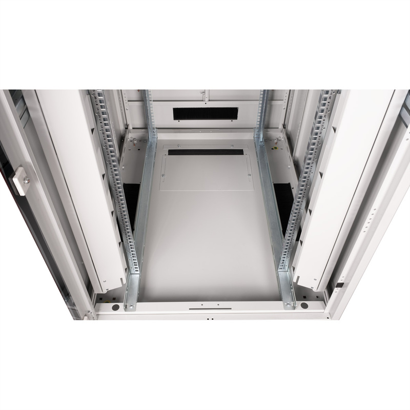 The network cabinets in the ROLINE Pro series have been developed to enable particularly convenient and flexible network cabling. With brush inlets in the roof and base area (from 26U and 800 mm cabinet width), a slide-on inlet in the base chassis with foam rubber seal and brush strips above and below the rear door (from 26U), they offer a wide range of possible uses for various application scenarios. Vertical cable ducts with cover, installed next to the profile rails (from 800 mm enclosure width), complete the design. A stepped, removable cover with ventilation slots improves air circulation and allows easy installation of a fan module. Two pairs of galvanised 19" profile rails are installed inside, which can be read in both directions and are adjustable in depth. They are also connected to additional depth struts in the enclosure. Each cabinet consists of a robust steel construction with a material thickness of up to 1.5 mm sheet steel.