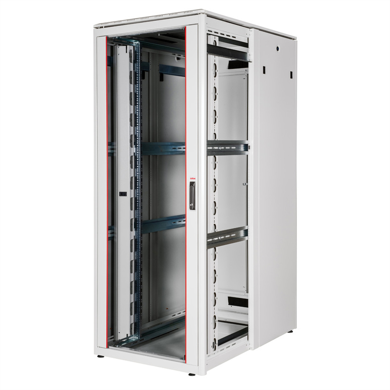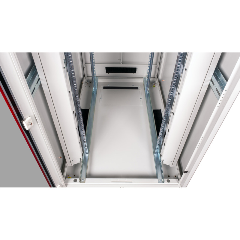 The network cabinets in the ROLINE Pro series have been developed to enable particularly convenient and flexible network cabling. With brush inlets in the roof and base area (from 26U and 800 mm cabinet width), a slide-on inlet in the base chassis with foam rubber seal and brush strips above and below the rear door (from 26U), they offer a wide range of possible uses for various application scenarios. Vertical cable ducts with cover, installed next to the profile rails (from 800 mm enclosure width), complete the design. A stepped, removable cover with ventilation slots improves air circulation and allows easy installation of a fan module. Two pairs of galvanised 19" profile rails are installed inside, which can be read in both directions and are adjustable in depth. They are also connected to additional depth struts in the enclosure. Each cabinet consists of a robust steel construction with a material thickness of up to 1.5 mm sheet steel.