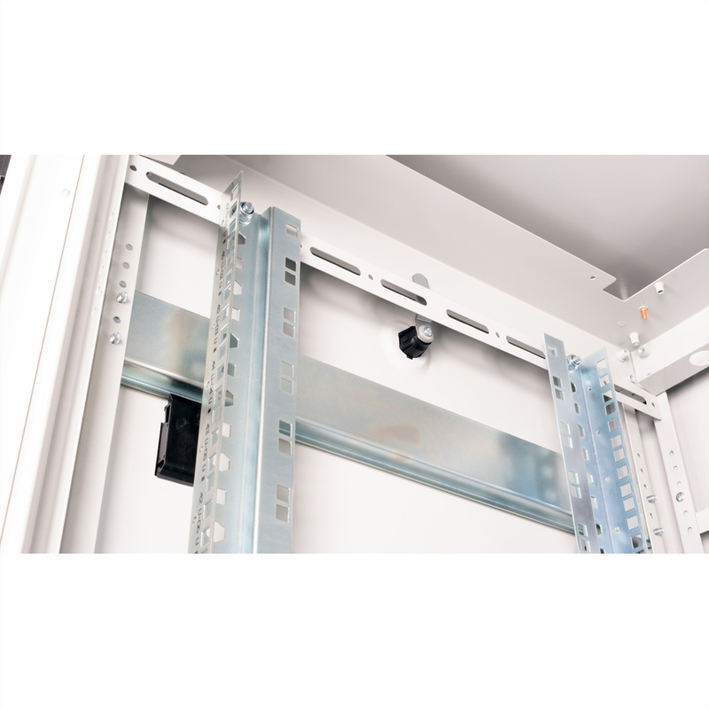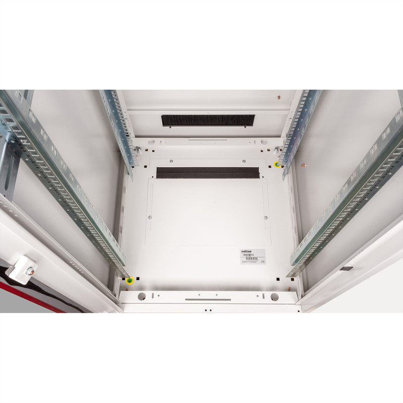 The network cabinets in the ROLINE Pro series have been developed to enable particularly convenient and flexible network cabling. With brush inlets in the roof and base area (from 26U and 800 mm cabinet width), a slide-on inlet in the base chassis with foam rubber seal and brush strips above and below the rear door (from 26U), they offer a wide range of possible uses for various application scenarios. Vertical cable ducts with cover, installed next to the profile rails (from 800 mm enclosure width), complete the design. A stepped, removable cover with ventilation slots improves air circulation and allows easy installation of a fan module. Two pairs of galvanised 19" profile rails are installed inside, which can be read in both directions and are adjustable in depth. They are also connected to additional depth struts in the enclosure. Each cabinet consists of a robust steel construction with a material thickness of up to 1.5 mm sheet steel.