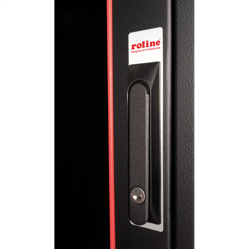 The network cabinets in the ROLINE Pro series have been developed to enable particularly convenient and flexible network cabling. With brush inlets in the roof and base area (from 26U and 800 mm cabinet width), a slide-on inlet in the base chassis with foam rubber seal and brush strips above and below the rear door (from 26U), they offer a wide range of possible uses for various application scenarios. Vertical cable ducts with cover, installed next to the profile rails (from 800 mm enclosure width), complete the design. A stepped, removable cover with ventilation slots improves air circulation and allows easy installation of a fan module. Two pairs of galvanised 19" profile rails are installed inside, which can be read in both directions and are adjustable in depth. They are also connected to additional depth struts in the enclosure. Each cabinet consists of a robust steel construction with a material thickness of up to 1.5 mm sheet steel.