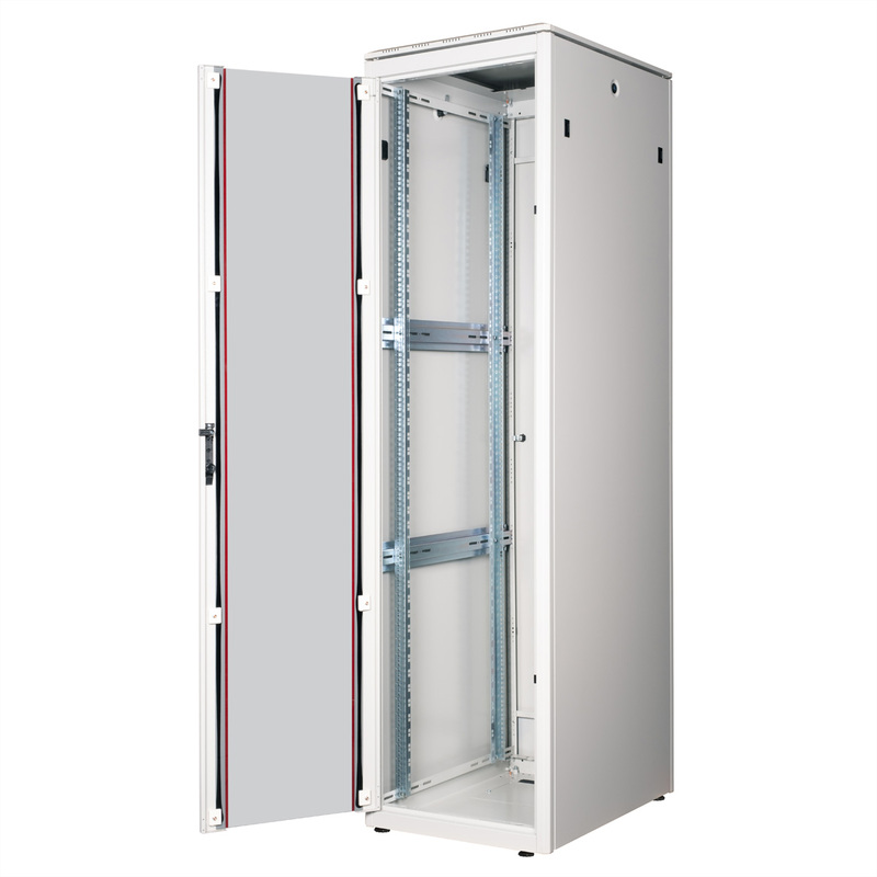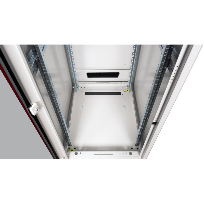 The network cabinets in the ROLINE Pro series have been developed to enable particularly convenient and flexible network cabling. With brush inlets in the roof and base area (from 26U and 800 mm cabinet width), a slide-on inlet in the base chassis with foam rubber seal and brush strips above and below the rear door (from 26U), they offer a wide range of possible uses for various application scenarios. Vertical cable ducts with cover, installed next to the profile rails (from 800 mm enclosure width), complete the design. A stepped, removable cover with ventilation slots improves air circulation and allows easy installation of a fan module. Two pairs of galvanised 19" profile rails are installed inside, which can be read in both directions and are adjustable in depth. They are also connected to additional depth struts in the enclosure. Each cabinet consists of a robust steel construction with a material thickness of up to 1.5 mm sheet steel.