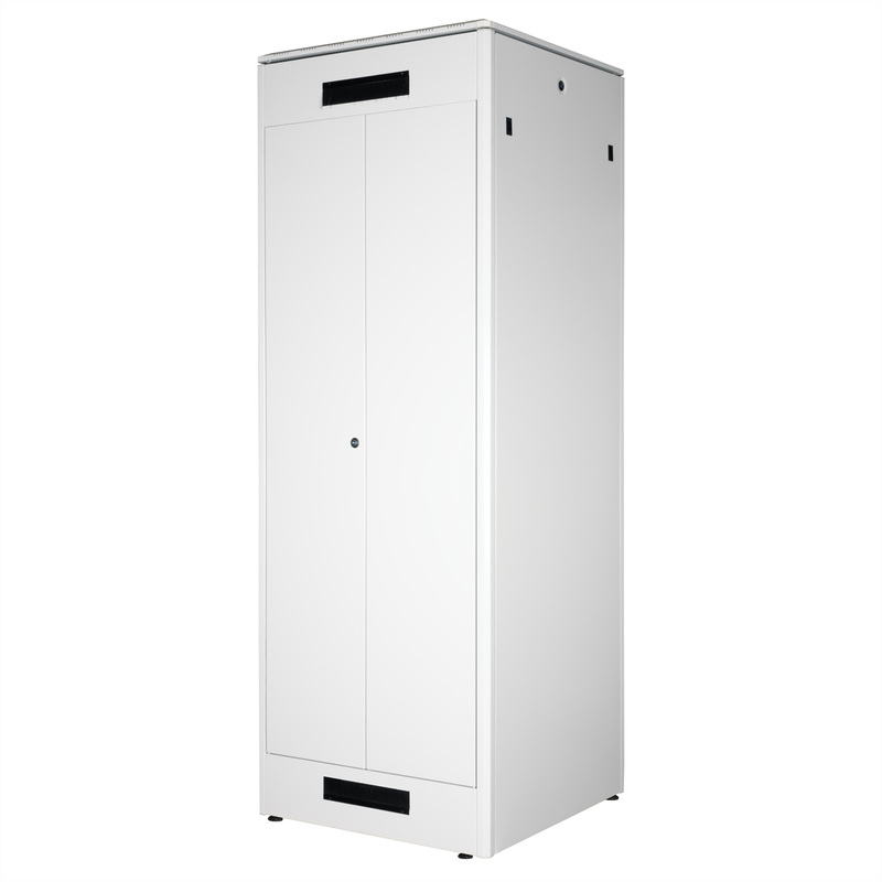 The network cabinets in the ROLINE Pro series have been developed to enable particularly convenient and flexible network cabling. With brush inlets in the roof and base area (from 26U and 800 mm cabinet width), a slide-on inlet in the base chassis with foam rubber seal and brush strips above and below the rear door (from 26U), they offer a wide range of possible uses for various application scenarios. Vertical cable ducts with cover, installed next to the profile rails (from 800 mm enclosure width), complete the design. A stepped, removable cover with ventilation slots improves air circulation and allows easy installation of a fan module. Two pairs of galvanised 19" profile rails are installed inside, which can be read in both directions and are adjustable in depth. They are also connected to additional depth struts in the enclosure. Each cabinet consists of a robust steel construction with a material thickness of up to 1.5 mm sheet steel.