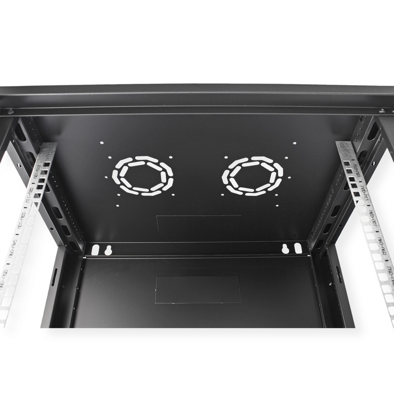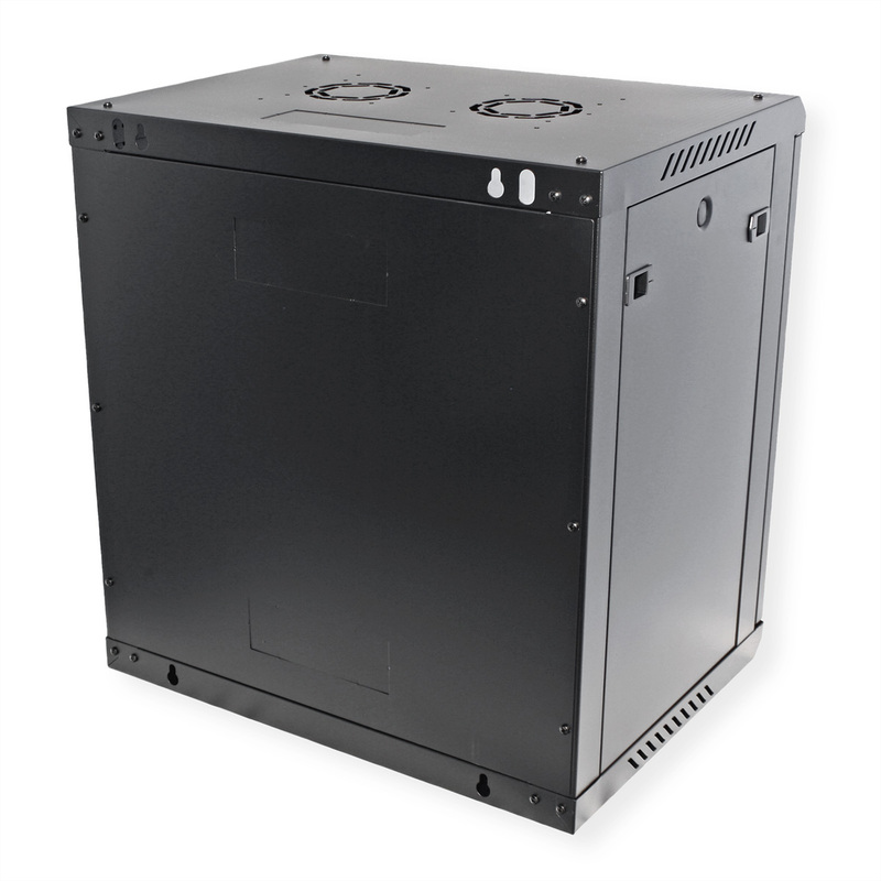 The wall-mounted enclosures in the ROLINE Basic Plus series have been specially designed for flexible network cabling. This series represents an ideal balance between the ROLINE PRO and ROLINE Basic series. The base plate and the roof are equipped with a punched cable inlet. In addition, a punched-out area in the roof makes it possible to accommodate a fan module. Inside, a pair of galvanised profile rails with height units of 483 mm (19") are installed, which are also adjustable in depth. The robust steel constructions of the cabinets are made of strong sheet steel and are available powder-coated in grey (RAL 7035) or black (RAL 9005). The side panels are fitted with a quick-release fastener and are removable, which improves accessibility. An optional lock can also be installed in the side panels. Wall mounting is carried out in two simple steps: Firstly, the rear panel is screwed to the wall and then connected to the housing. Optional levelling feet or castors can be used to make the cabinets free-standing.