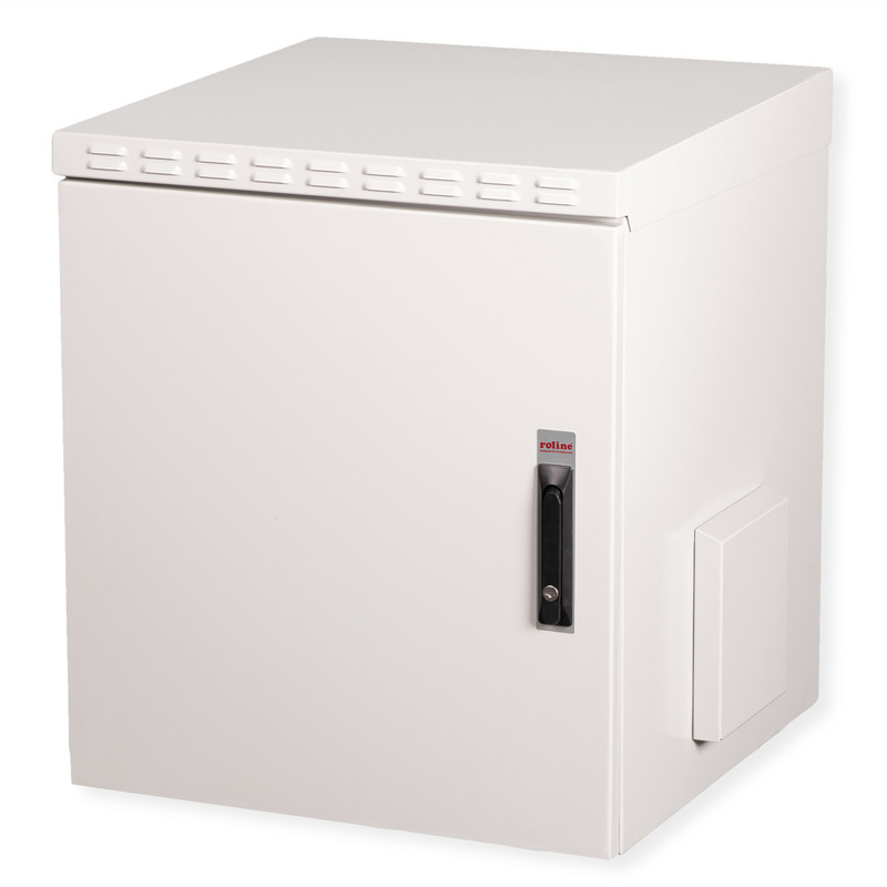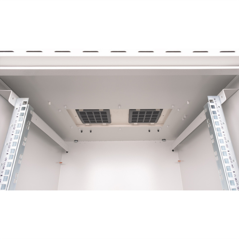 The outdoor network enclosures for wall mounting are developed in accordance with protection class IP55 and are specially designed for use in harsh environments, particularly outdoors. The wall-mounted enclosures offer a 3-point locking system with lockable swivelling handle and insulated PG cable glands. Integrated ventilation filter housings ensure ventilation and provide protection against water and dust in accordance with IP54. These enclosures are ideal for outdoor areas that are exposed to environmental influences such as rain, hail and splash water. The roof chassis is equipped with a filtered area for the installation of a fan module. Inside there is a pair (from 600 mm depth two pairs) of galvanised 19" profile rails, which can be read in both directions and are adjustable in depth. Each cabinet consists of a robust steel construction with a material thickness of up to 2.0 mm.