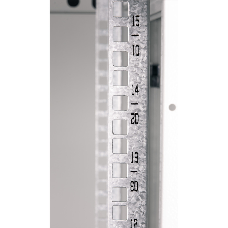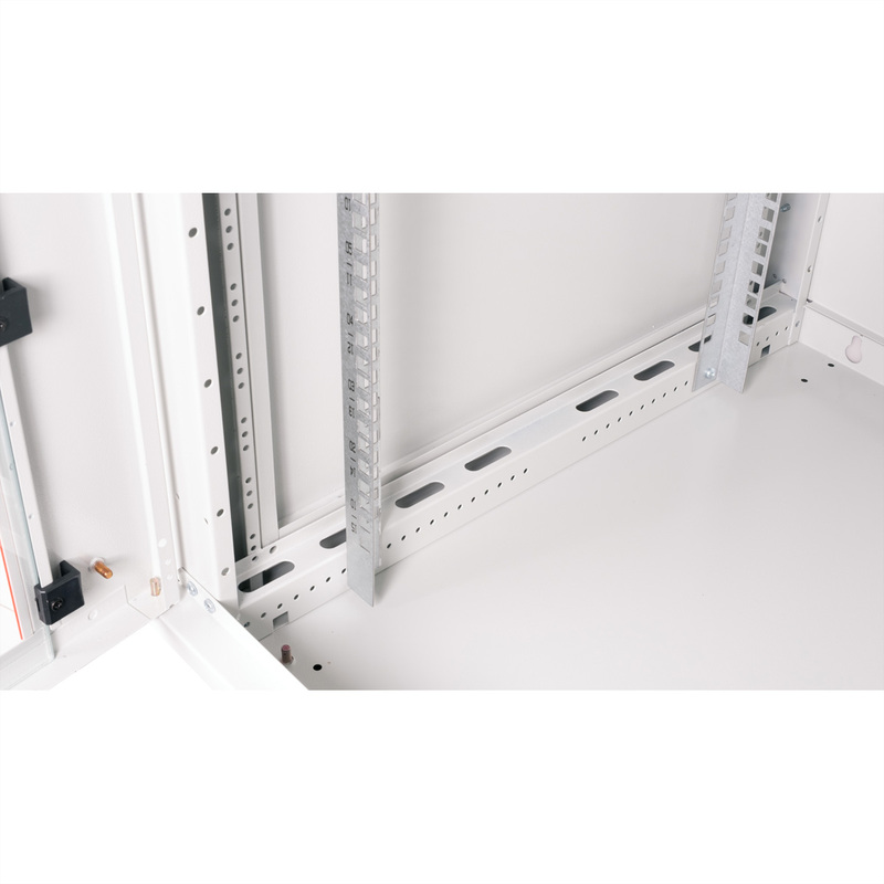The wall-mounted enclosures in the ROLINE Basic Plus series have been specially designed for flexible network cabling. This series represents an ideal balance between the ROLINE PRO and ROLINE Basic series. The base plate and the roof are equipped with a punched cable inlet. In addition, a punched-out area in the roof makes it possible to accommodate a fan module. Inside, a pair of galvanised profile rails with height units of 483 mm (19") are installed, which are also adjustable in depth. The robust steel constructions of the cabinets are made of strong sheet steel and are available powder-coated in grey (RAL 7035) or black (RAL 9005). The side panels are fitted with a quick-release fastener and are removable, which improves accessibility. An optional lock can also be installed in the side panels. Wall mounting is carried out in two simple steps: Firstly, the rear panel is screwed to the wall and then connected to the housing. Optional levelling feet or castors can be used to make the cabinets free-standing.