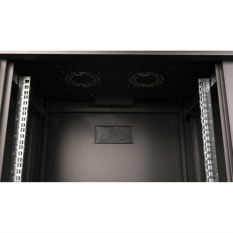 The wall-mounted enclosures in the ROLINE Pro series have been specially designed for flexible network cabling. Each enclosure has a slide-on cable inlet in the roof with a foam rubber seal. The rear panel and the base plate are equipped with punched cable inlets and plastic covers. The roof chassis has a punched-out area to accommodate a fan module. Inside, a pair of galvanised profile rails with height units of 483 mm (19") are installed, which are also adjustable in depth. The robust steel constructions of the cabinets are made of up to 1.5 mm thick sheet steel and are available powder-coated in grey (RAL 7035) or black (RAL 9005). The side panels and front door are modular, lockable and removable, which improves accessibility. Wall mounting is carried out in two simple steps: Firstly, the rear panel is screwed to the wall and then connected to the housing. Optional levelling feet or castors can be used to make the enclosures free-standing.