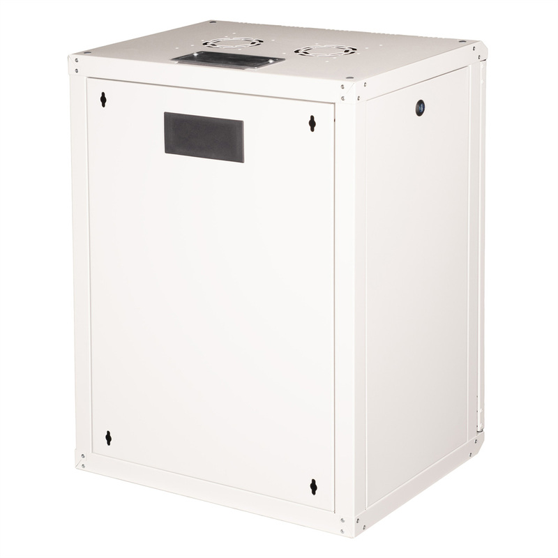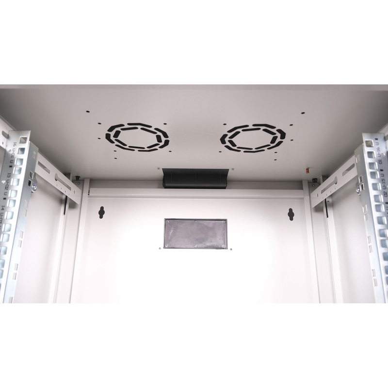 The wall-mounted enclosures in the ROLINE Pro series have been specially designed for flexible network cabling. Each enclosure has a slide-on cable inlet in the roof with a foam rubber seal. The rear panel and the base plate are equipped with punched cable inlets and plastic covers. The roof chassis has a punched-out area to accommodate a fan module. Inside, a pair of galvanised profile rails with height units of 483 mm (19") are installed, which are also adjustable in depth. The robust steel constructions of the cabinets are made of up to 1.5 mm thick sheet steel and are available powder-coated in grey (RAL 7035) or black (RAL 9005). The side panels and front door are modular, lockable and removable, which improves accessibility. Wall mounting is carried out in two simple steps: Firstly, the rear panel is screwed to the wall and then connected to the housing. Optional levelling feet or castors can be used to make the enclosures free-standing.