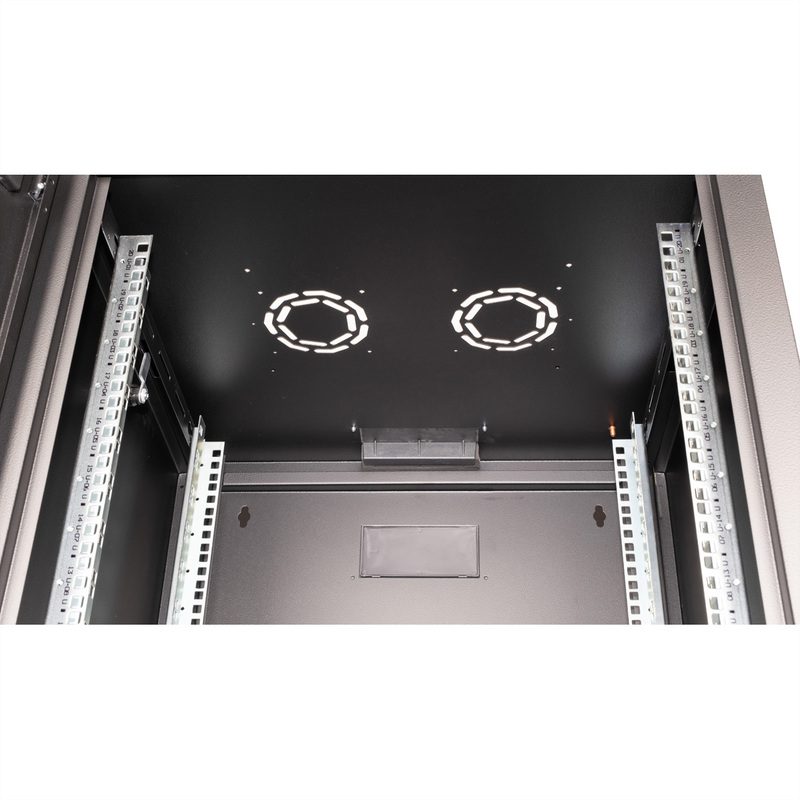 The wall-mounted enclosures in the ROLINE Pro series have been specially designed for flexible network cabling. Each enclosure has a slide-on cable inlet in the roof with a foam rubber seal. The rear panel and the base plate are equipped with punched cable inlets and plastic covers. The roof chassis has a punched-out area to accommodate a fan module. Inside, two pairs of galvanised profile rails with height units of 483 mm (19") are installed, which are also adjustable in depth. The robust steel constructions of the cabinets are made of up to 1.5 mm thick sheet steel and are available powder-coated in grey (RAL 7035) or black (RAL 9005). The side panels and front door are modular, lockable and removable, which improves accessibility. Wall mounting is carried out in two simple steps: Firstly, the rear panel is screwed to the wall and then connected to the housing. Optional levelling feet or castors can be used to make the enclosures free-standing.