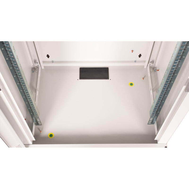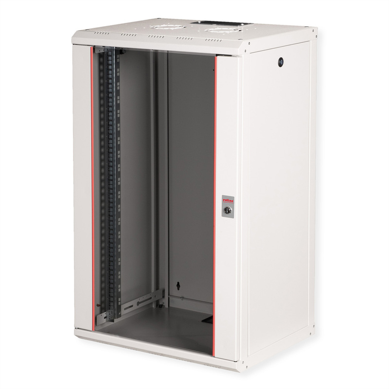 The wall-mounted enclosures in the ROLINE Pro series have been specially designed for flexible network cabling. Each enclosure has a slide-on cable inlet in the roof with a foam rubber seal. The rear panel and the base plate are equipped with punched cable inlets and plastic covers. The roof chassis has a punched-out area to accommodate a fan module. Inside, two pairs of galvanised profile rails with height units of 483 mm (19") are installed, which are also adjustable in depth. The robust steel constructions of the cabinets are made of up to 1.5 mm thick sheet steel and are available powder-coated in grey (RAL 7035) or black (RAL 9005). The side panels and front door are modular, lockable and removable, which improves accessibility. Wall mounting is carried out in two simple steps: Firstly, the rear panel is screwed to the wall and then connected to the housing. Optional levelling feet or castors can be used to make the enclosures free-standing.