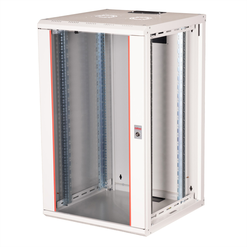 The wall-mounted enclosures in the ROLINE Pro series have been specially designed for flexible network cabling. Each enclosure has a slide-on cable inlet in the roof with a foam rubber seal. The rear panel and the base plate are equipped with punched cable inlets and plastic covers. The roof chassis has a punched-out area to accommodate a fan module. Inside, two pairs of galvanised profile rails with height units of 483 mm (19") are installed, which are also adjustable in depth. The robust steel constructions of the cabinets are made of up to 1.5 mm thick sheet steel and are available powder-coated in grey (RAL 7035) or black (RAL 9005). The side panels and front door are modular, lockable and removable, which improves accessibility. Wall mounting is carried out in two simple steps: Firstly, the rear panel is screwed to the wall and then connected to the housing. Optional levelling feet or castors can be used to make the enclosures free-standing.
