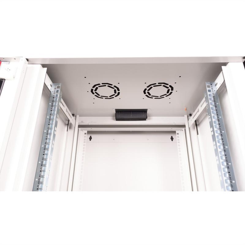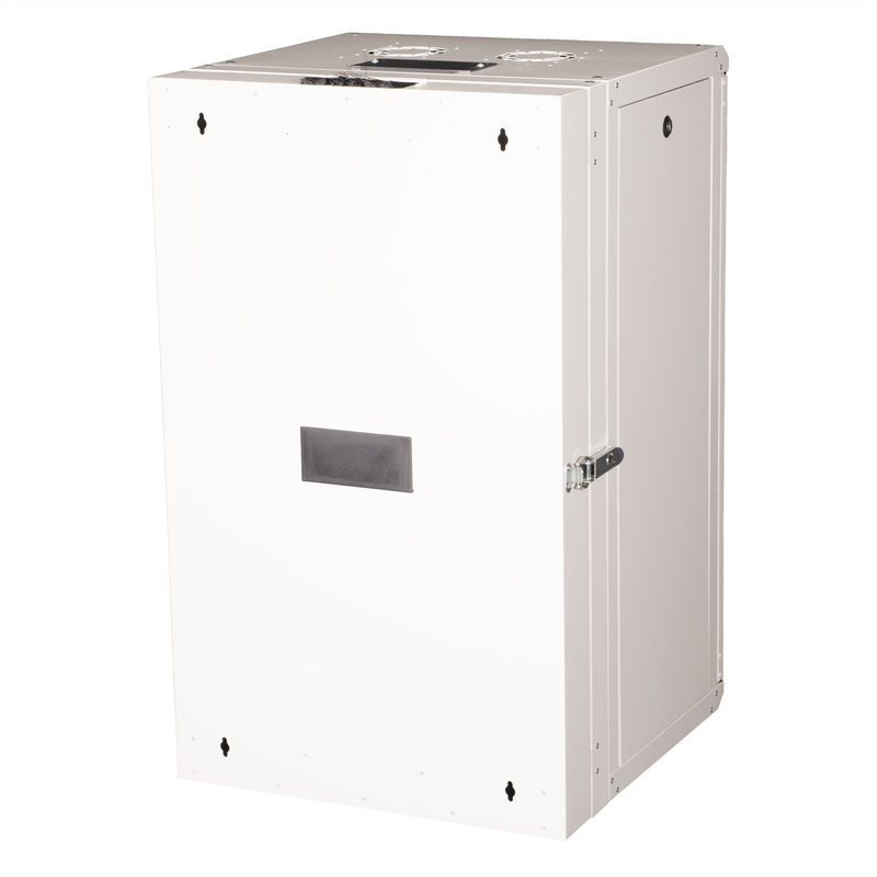 The wall-mounted enclosures in the ROLINE Pro series have been specially designed for flexible network cabling. The integrated hinge in the rear frame allows the enclosure to be folded to the side if required. Each enclosure has a sliding cable inlet with a foam rubber seal in the roof. The rear panel and base are fitted with punched cable inlets and plastic covers. The rear frame is fitted with brush strips at the top and bottom. The roof chassis is already provided with a suitable cut-out for installing a fan module. Inside there are galvanised 19" profile rails that can be read in both directions and are adjustable in depth. The rear frame also has 19" perforations. Each cabinet consists of a robust steel construction made of up to 1.5 mm thick sheet steel and is electrostatically powder-coated in the standard colours grey (RAL 7035) and black (RAL 9005). Modular lockable and removable side panels and a lockable and removable front door improve accessibility. The door hinge can be changed.