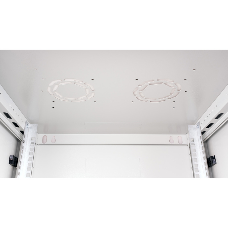 The wall-mounted enclosures in the ROLINE Basic Plus series have been specially designed for flexible network cabling. This series represents an ideal balance between the ROLINE PRO and ROLINE Basic series. The base plate and the roof are equipped with a punched cable inlet. In addition, a punched-out area in the roof makes it possible to accommodate a fan module. Inside, a pair of galvanised profile rails with height units of 483 mm (19") are installed, which are also adjustable in depth. The robust steel constructions of the cabinets are made of strong sheet steel and are available powder-coated in grey (RAL 7035) or black (RAL 9005). The side panels are fitted with a quick-release fastener and are removable, which improves accessibility. An optional lock can also be installed in the side panels. Wall mounting is carried out in two simple steps: Firstly, the rear panel is screwed to the wall and then connected to the housing. Optional levelling feet or castors can be used to make the cabinets free-standing.