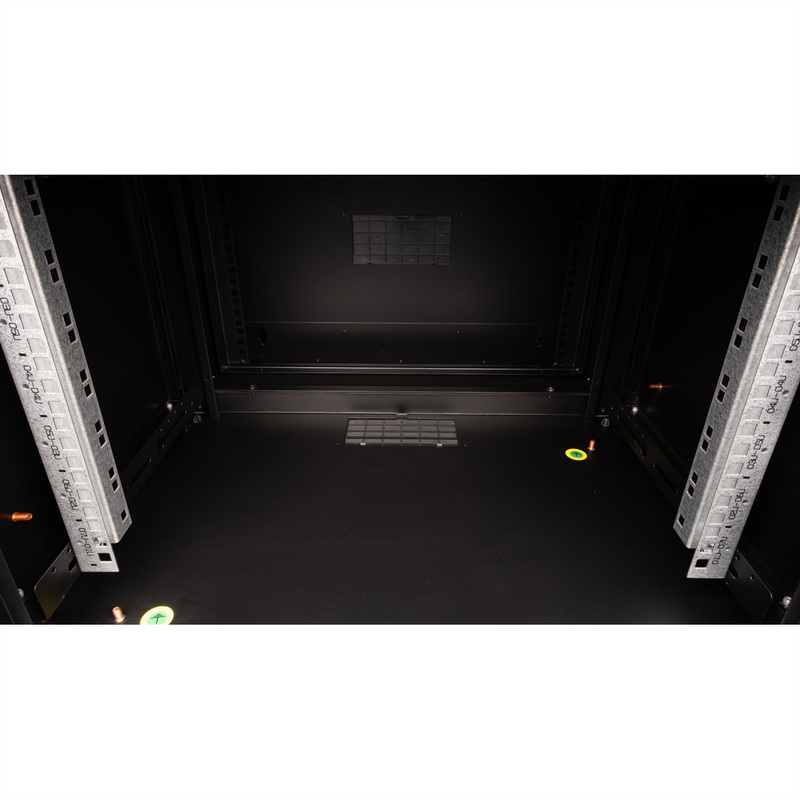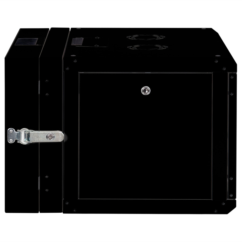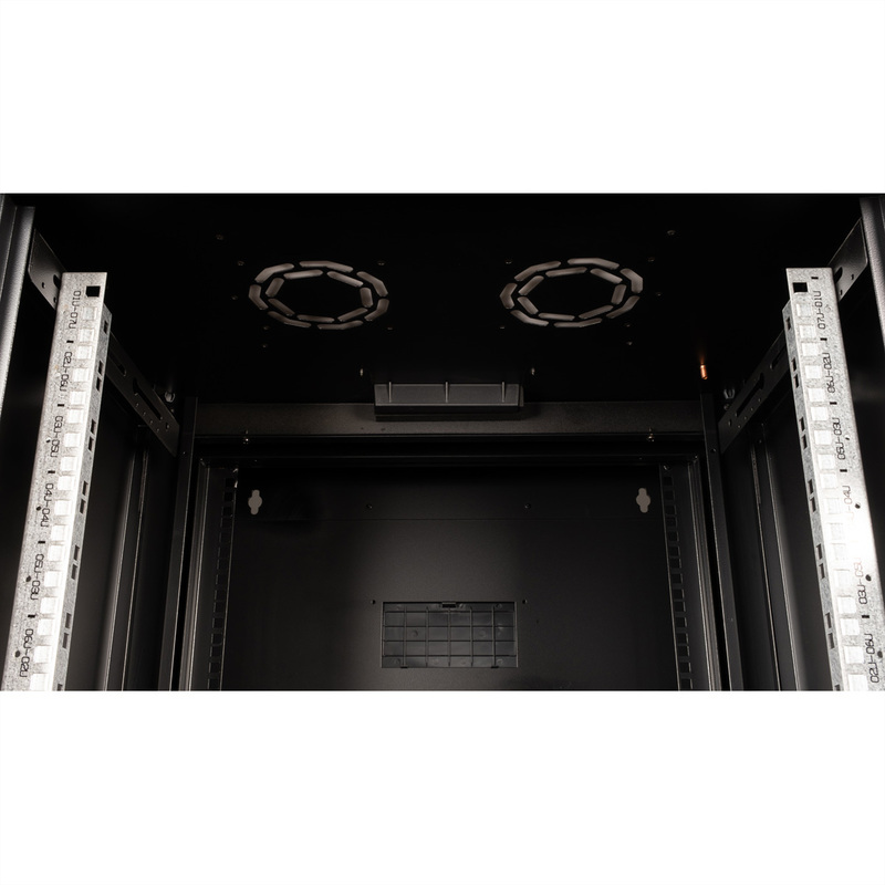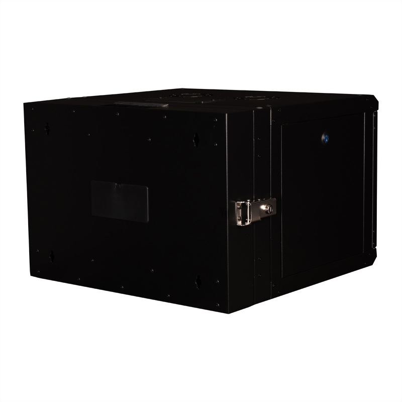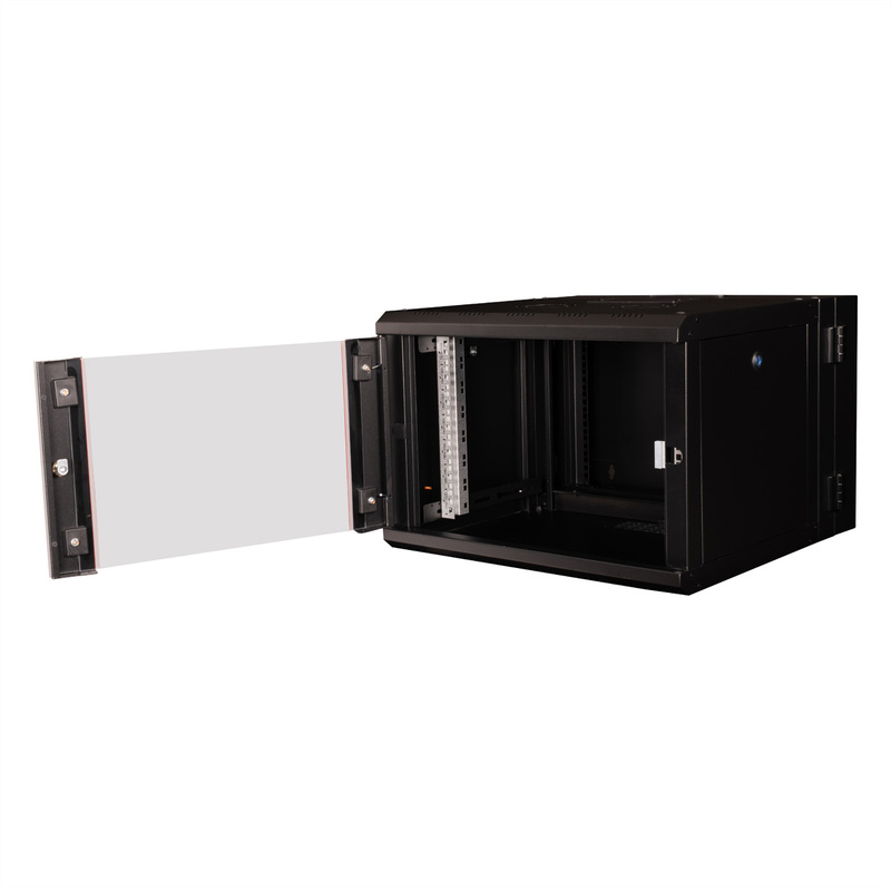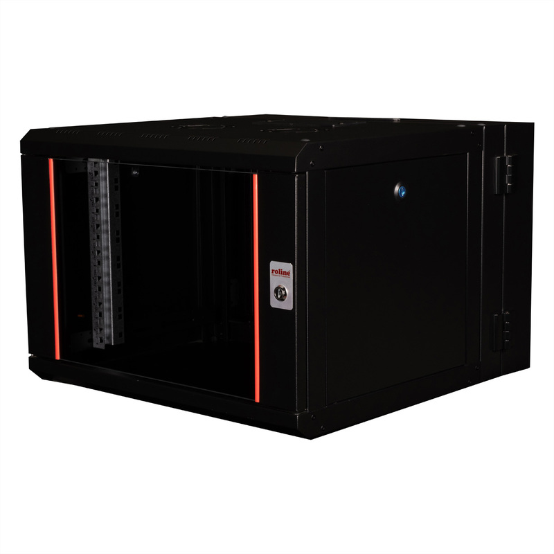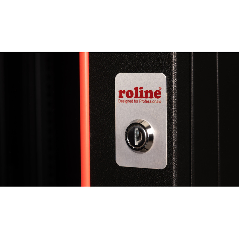 The wall-mounted enclosures in the ROLINE Pro series have been specially designed for flexible network cabling. The integrated hinge in the rear frame allows the enclosure to be folded to the side if required. Each enclosure has a sliding cable inlet with a foam rubber seal in the roof. The rear panel and base are fitted with punched cable inlets and plastic covers. The rear frame is fitted with brush strips at the top and bottom. The roof chassis is already provided with a suitable cut-out for installing a fan module. Inside there are galvanised 19" profile rails that can be read in both directions and are adjustable in depth. The rear frame also has 19" perforations. Each cabinet consists of a robust steel construction made of up to 1.5 mm thick sheet steel and is electrostatically powder-coated in the standard colours grey (RAL 7035) and black (RAL 9005). Modular lockable and removable side panels and a lockable and removable front door improve accessibility. The door hinge can be changed.