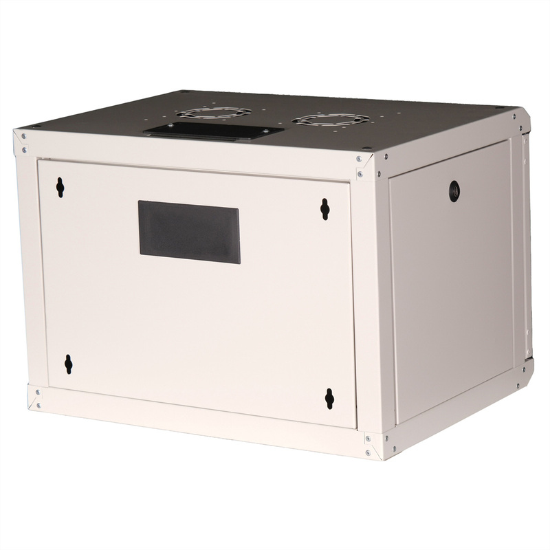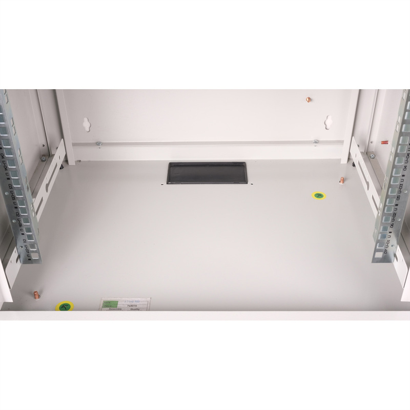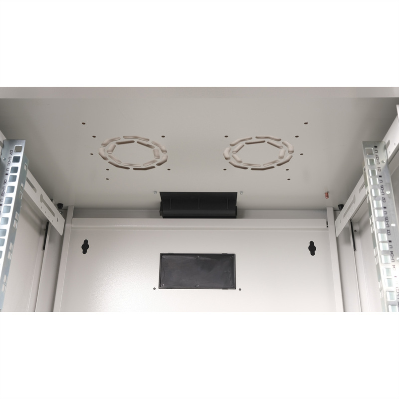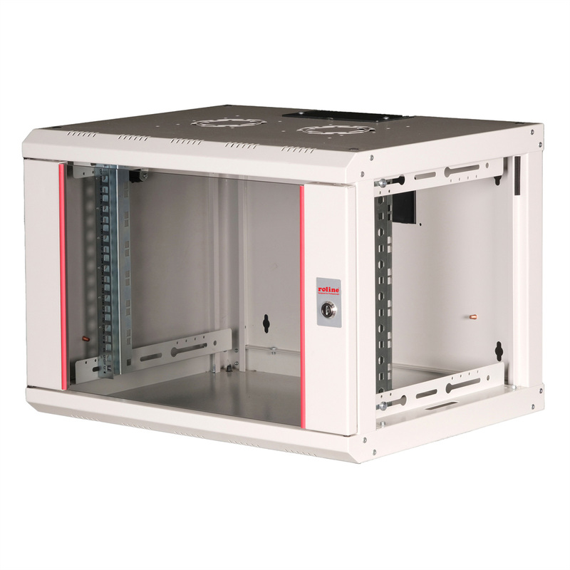 The ROLINE Pro series wall-mounted enclosures have been specially designed for flexible network cabling. Each enclosure has a slide-on cable inlet in the roof with a foam rubber seal. The rear panel and the base plate are equipped with punched cable inlets and plastic covers. The roof chassis has a punched-out area to accommodate a fan module. Inside, a pair of galvanised profile rails with height units of 483 mm (19") are installed, which are also adjustable in depth. The robust steel constructions of the cabinets are made of up to 1.5 mm thick sheet steel and are available powder-coated in grey (RAL 7035) or black (RAL 9005). The side panels and front door are modular, lockable and removable, which improves accessibility. Wall mounting is carried out in two simple steps: Firstly, the rear panel is screwed to the wall and then connected to the housing. Optional levelling feet or castors can be used to make the enclosures free-standing.