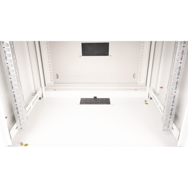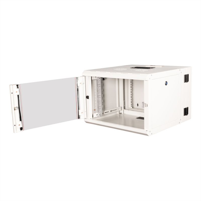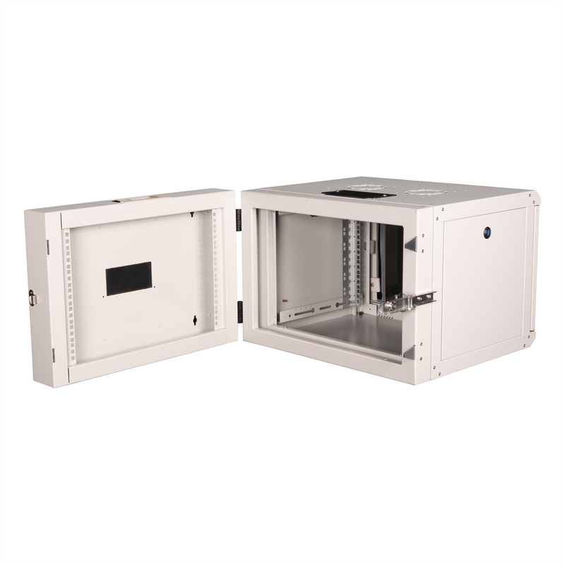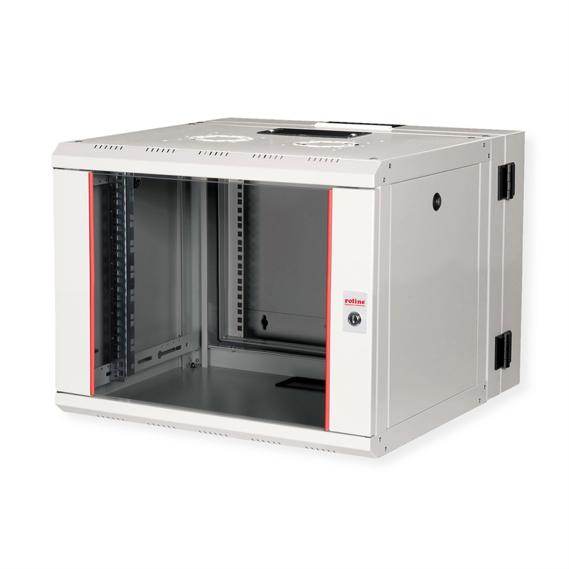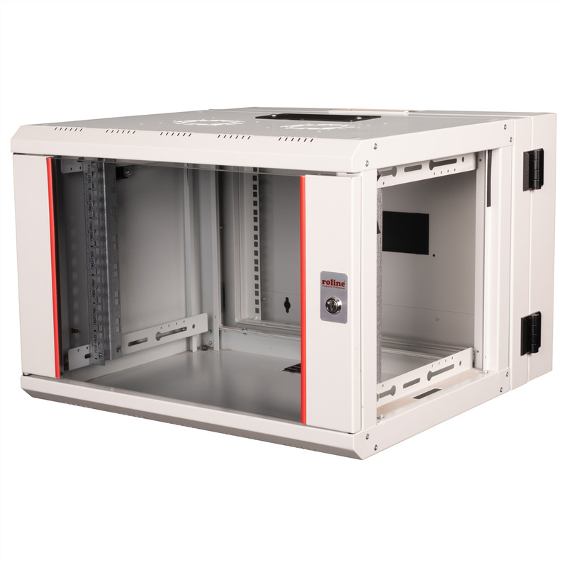 The wall-mounted enclosures in the ROLINE Pro series have been specially designed for flexible network cabling. The integrated hinge in the rear frame allows the enclosure to be folded to the side if required. Each enclosure has a sliding cable inlet with a foam rubber seal in the roof. The rear panel and base are fitted with punched cable inlets and plastic covers. The rear frame is fitted with brush strips at the top and bottom. The roof chassis is already provided with a suitable cut-out for installing a fan module. Inside there are galvanised 19" profile rails that can be read in both directions and are adjustable in depth. The rear frame also has 19" perforations. Each cabinet consists of a robust steel construction made of up to 1.5 mm thick sheet steel and is electrostatically powder-coated in the standard colours grey (RAL 7035) and black (RAL 9005). Modular lockable and removable side panels and a lockable and removable front door improve accessibility. The door hinge can be changed.