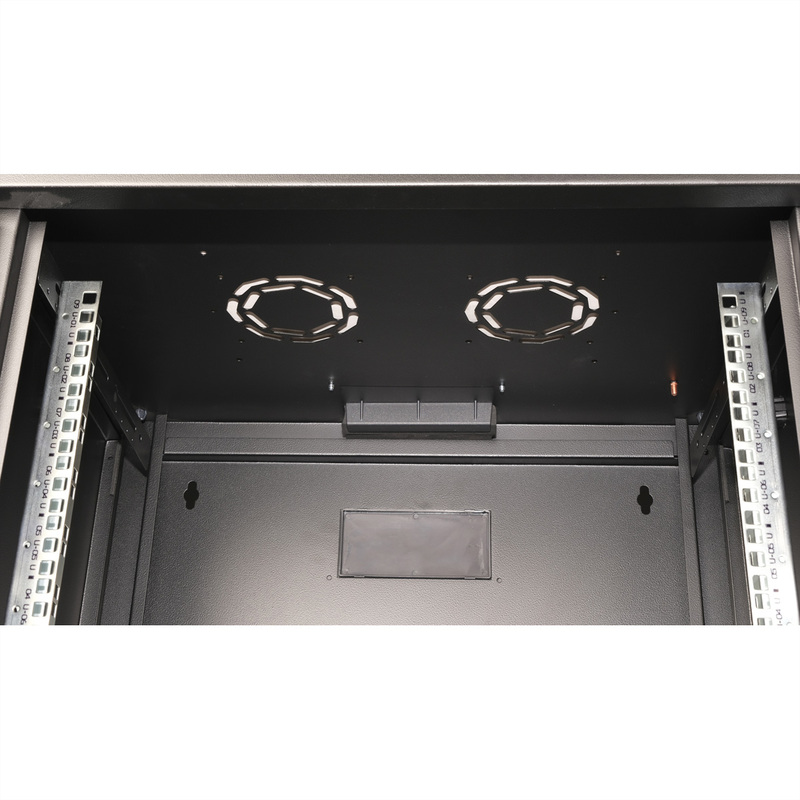 The wall-mounted enclosures in the ROLINE Pro series have been specially designed for flexible network cabling. Each enclosure has a slide-on cable inlet in the roof with a foam rubber seal. The rear panel and the base plate are equipped with punched cable inlets and plastic covers. The roof chassis has a punched-out area to accommodate a fan module. Inside, two pairs of galvanised profile rails with height units of 483 mm (19") are installed, which are also adjustable in depth. The robust steel constructions of the cabinets are made of up to 1.5 mm thick sheet steel and are available powder-coated in grey (RAL 7035) or black (RAL 9005). The side panels and front door are modular, lockable and removable, which improves accessibility. Wall mounting is carried out in two simple steps: Firstly, the rear panel is screwed to the wall and then connected to the housing. Optional levelling feet or castors can be used to make the enclosures free-standing.
