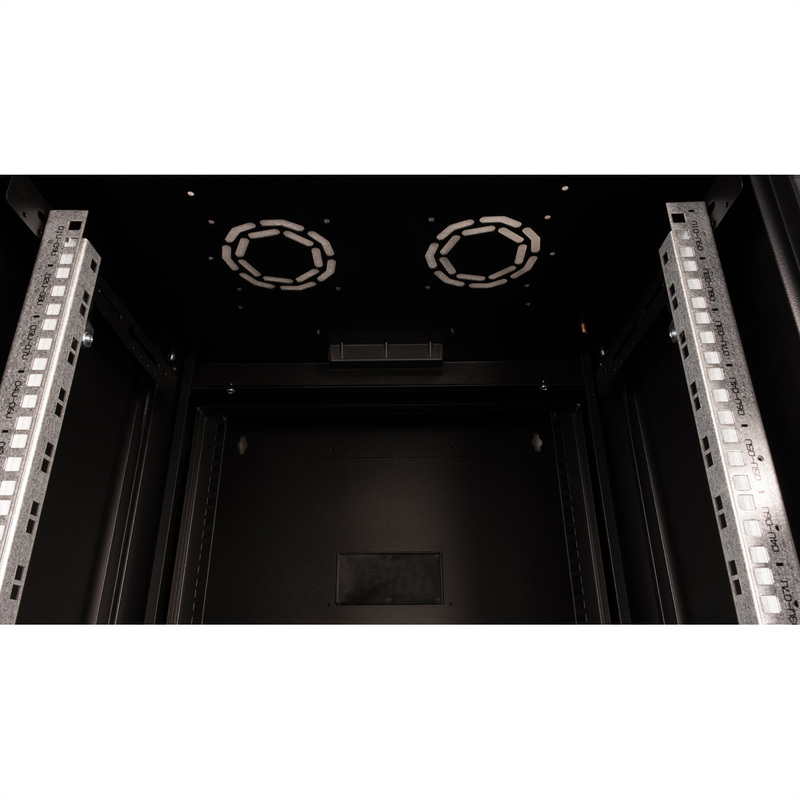 The wall-mounted enclosures in the ROLINE Pro series have been specially designed for flexible network cabling. The integrated hinge in the rear frame allows the enclosure to be folded to the side if required. Each enclosure has a sliding cable inlet with a foam rubber seal in the roof. The rear panel and base are fitted with punched cable inlets and plastic covers. The rear frame is fitted with brush strips at the top and bottom. The roof chassis is already provided with a suitable cut-out for installing a fan module. Inside there are galvanised 19" profile rails that can be read in both directions and are adjustable in depth. The rear frame also has 19" perforations. Each cabinet consists of a robust steel construction made of up to 1.5 mm thick sheet steel and is electrostatically powder-coated in the standard colours grey (RAL 7035) and black (RAL 9005). Modular lockable and removable side panels and a lockable and removable front door improve accessibility. The door hinge can be changed.