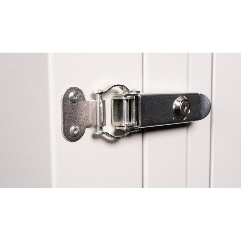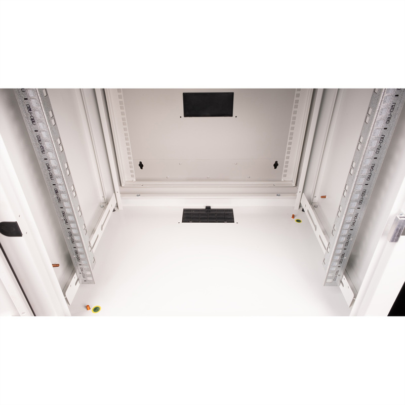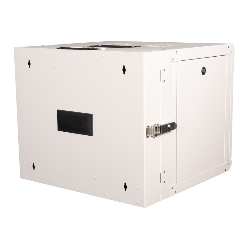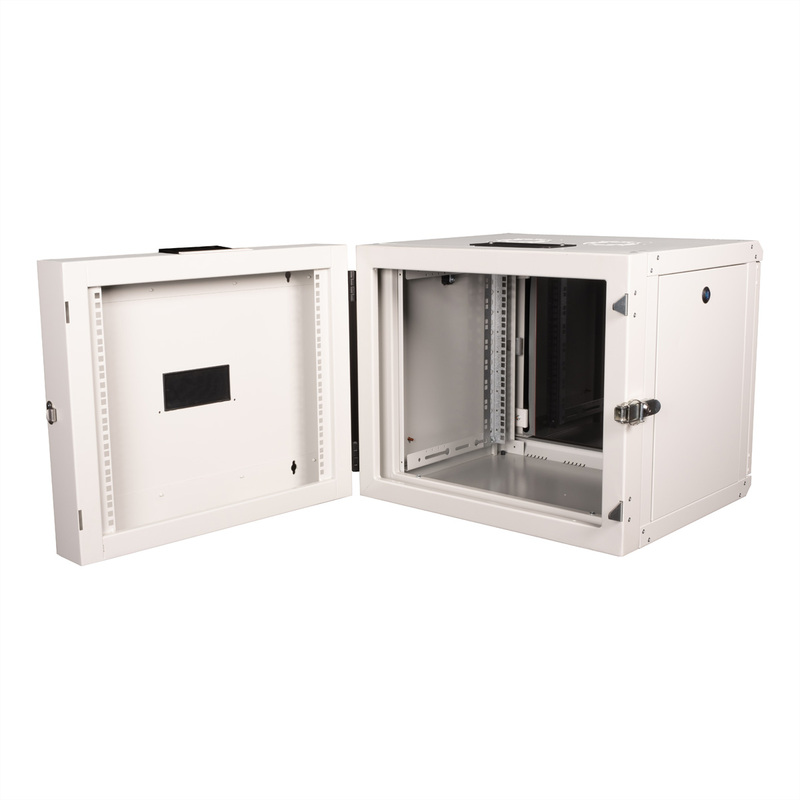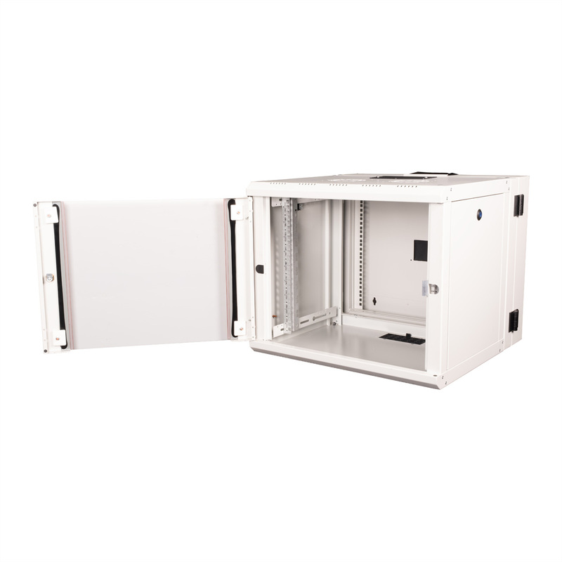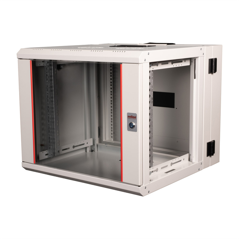 The wall-mounted enclosures in the ROLINE Pro series have been specially designed for flexible network cabling. The integrated hinge in the rear frame allows the enclosure to be folded to the side if required. Each enclosure has a sliding cable inlet with a foam rubber seal in the roof. The rear panel and base are fitted with punched cable inlets and plastic covers. The rear frame is fitted with brush strips at the top and bottom. The roof chassis is already provided with a suitable cut-out for installing a fan module. Inside there are galvanised 19" profile rails that can be read in both directions and are adjustable in depth. The rear frame also has 19" perforations. Each cabinet consists of a robust steel construction made of up to 1.5 mm thick sheet steel and is electrostatically powder-coated in the standard colours grey (RAL 7035) and black (RAL 9005). Modular lockable and removable side panels and a lockable and removable front door improve accessibility. The door hinge can be changed.