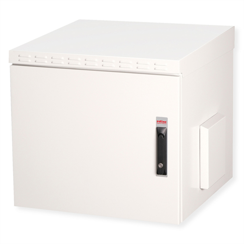 The outdoor network enclosures for wall mounting are developed in accordance with protection class IP55 and are specially designed for use in harsh environments, particularly outdoors. The wall-mounted enclosures offer a 3-point locking system with lockable swivelling handle and insulated PG cable glands. Integrated ventilation filter housings ensure ventilation and provide protection against water and dust in accordance with IP54. These enclosures are ideal for outdoor areas that are exposed to environmental influences such as rain, hail and splash water. The roof chassis is equipped with a filtered area for the installation of a fan module. Inside there is a pair (from 600 mm depth two pairs) of galvanised 19" profile rails, which can be read in both directions and are adjustable in depth. Each cabinet consists of a robust steel construction with a material thickness of up to 2.0 mm.