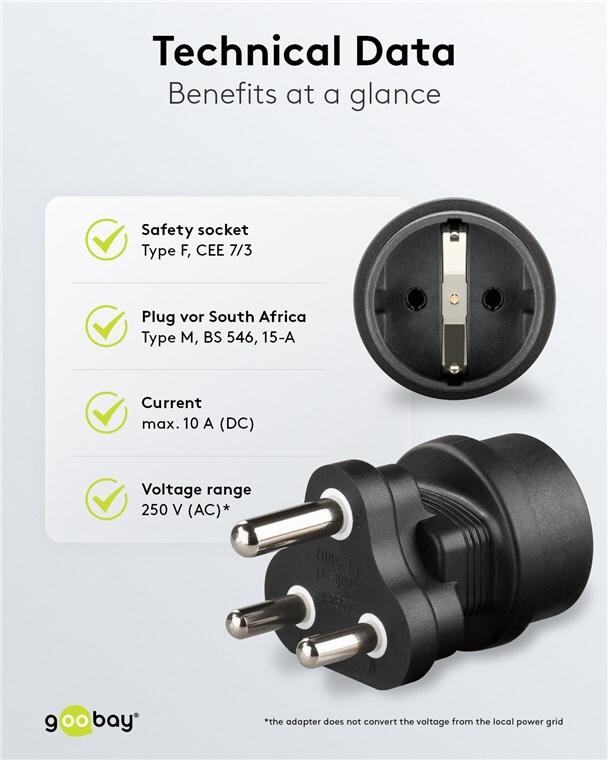 - Practical travel plug for connecting electrical appliances with safety plug (Type F) to sockets in South Africa (Type M)
