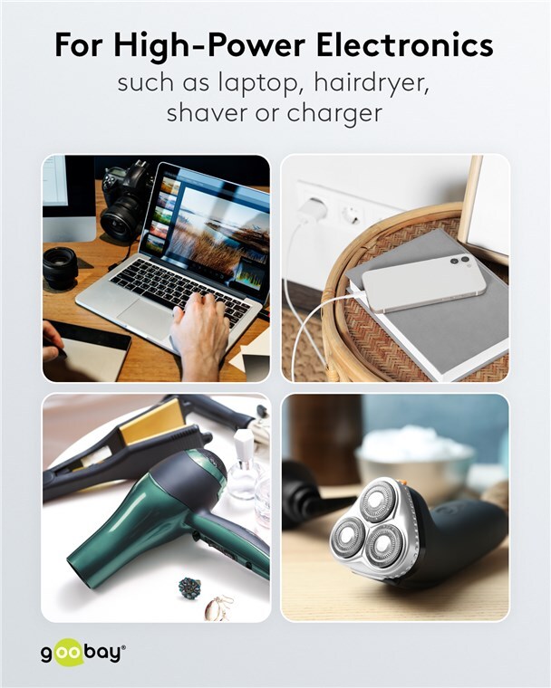 - Perfect as plug adapter for high-performance electronics such as chargers, laptops, game consoles, hair dryers or electric razors