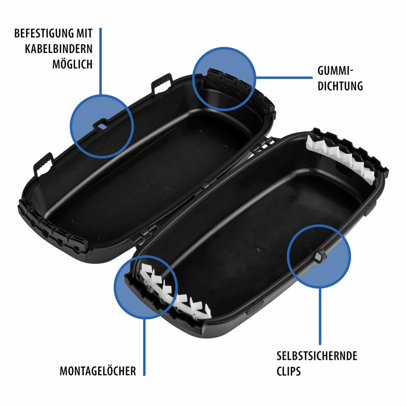 The waterproof EFB Elektronik outdoor box is easy to use: simply place the connections in the box, secure the cables with the clamps and close the box. The possibility of wall mounting and the lockable design offer additional convenience and protection.