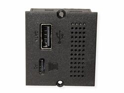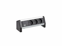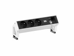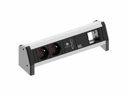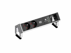 DESK 2 power strip Color: Black, painted similar to RAL9005 2xUTE sockets France 35° black with increased touch protection (power input on the back) 1xUSB double charger 5V DC / 3.1A 1xCustom module empty Supply cable: 0.2m H05VV-F 3G1.5mm² black with GST18 plug, with BACHMANN logo with mounting bracket, packed in a box.