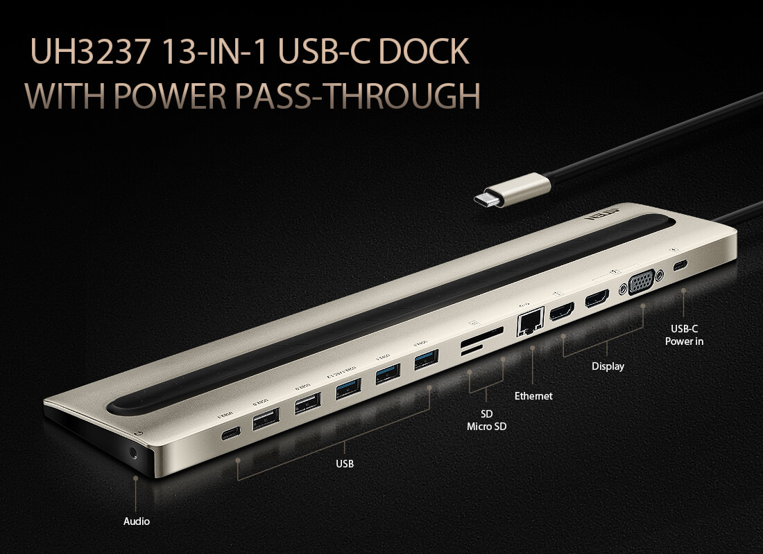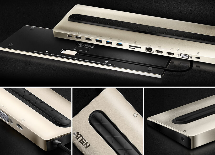 The ultra-sleek ATEN USB-C Multiport Dock is a one-step total upgrade for your laptop that provides all the extra expansion capabilities that you need. Simply use one cable to add up to 13 devices, with power delivery pass-through to boost your productivity with extra HDMI, VGA, USB 3.2 Gen 1, USB 2.0, SD/MicroSD, Ethernet and Audio connections.