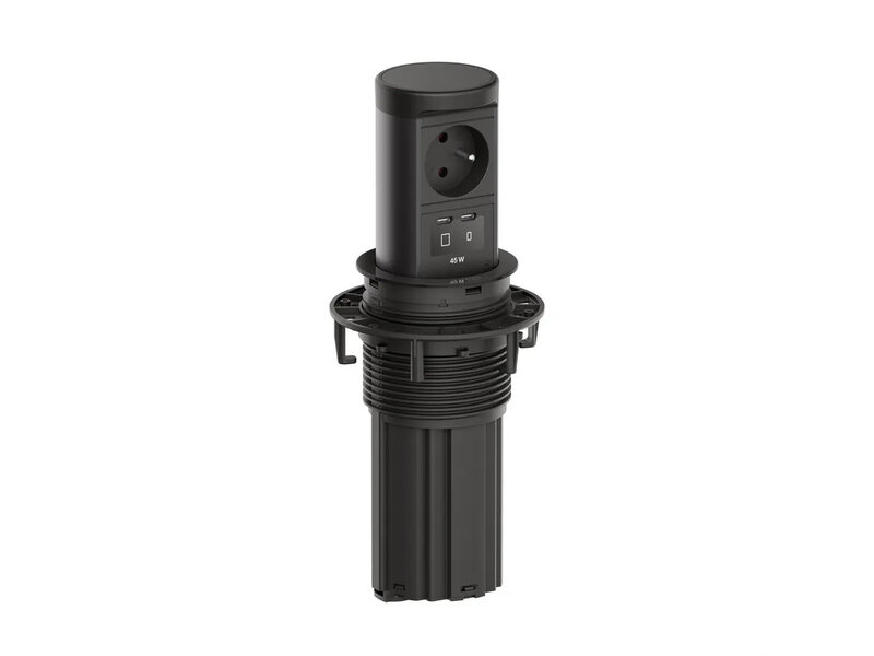 VÝŤAH 2, Výsuvná zásuvková jednotka, matná čierna podobná RAL 9005, 1x zásuvka UTE France čierna, so zvýšenou ochranou proti kontaktu, 1x nabíjačka USB C/C 45W, 2,0 m čierny kábel H05VV-F 3G1,5 mm², s koncovkami na upevnenie vodičov a priloženou bezpečnostnou zástrčkou, balené v kartónovej krabici.