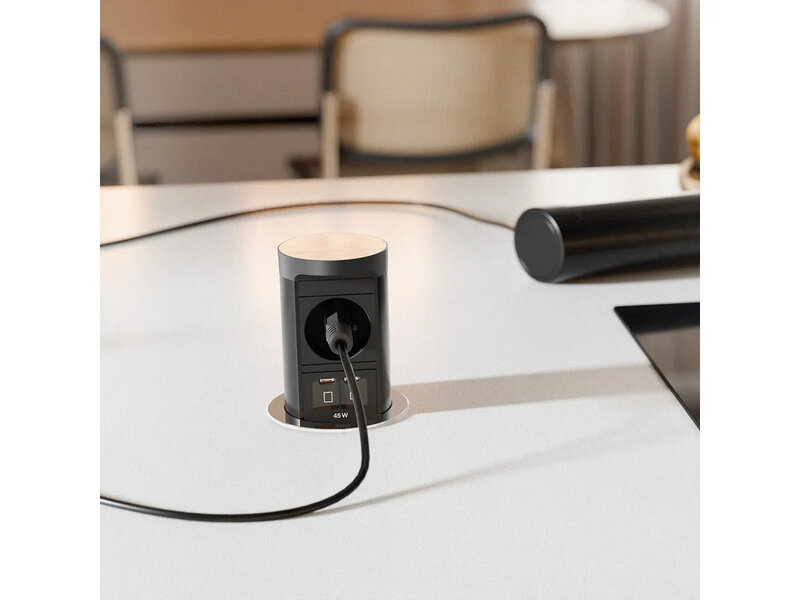 ELEVATOR 2, Výsuvná zásuvková jednotka, vzhľad nehrdzavejúcej ocele, 1x zásuvka UTE France čierna, so zvýšenou ochranou proti kontaktu, 1x nabíjačka USB C/C 45W, 2,0 m čierny kábel H05VV-F 3G1,5 mm², s koncovkami na upevnenie vodičov a priloženou bezpečnostnou zástrčkou, balené v kartónovej krabici.